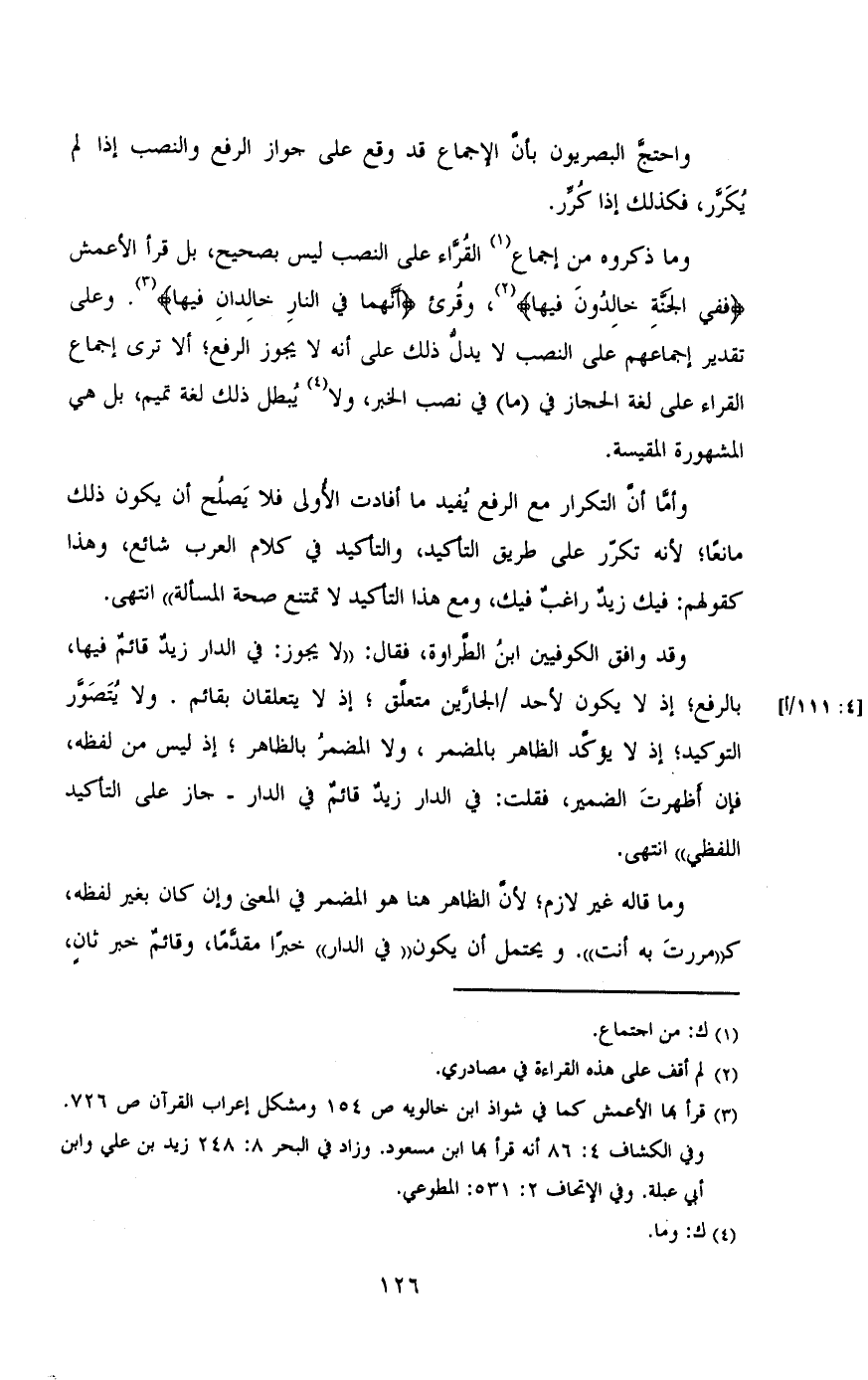وما ذكروه من اجماع القراء على النصب ليس بصحيح , بل قرأ الاعمش (ففى الجنة خالدون فيها) , وقرئ (أنهما فى النار خالدان فيها) وعلى تقدير إجماعهم على النصب لا يدل ذلك على أنه لا يجوز الرفع , ألا ترى إجماع القراء على لغة الحجاز فى (ما) فى نصب الخبر , ولا يبطل ذلك لغة تميم , بل هي المشهورة المقيسة.