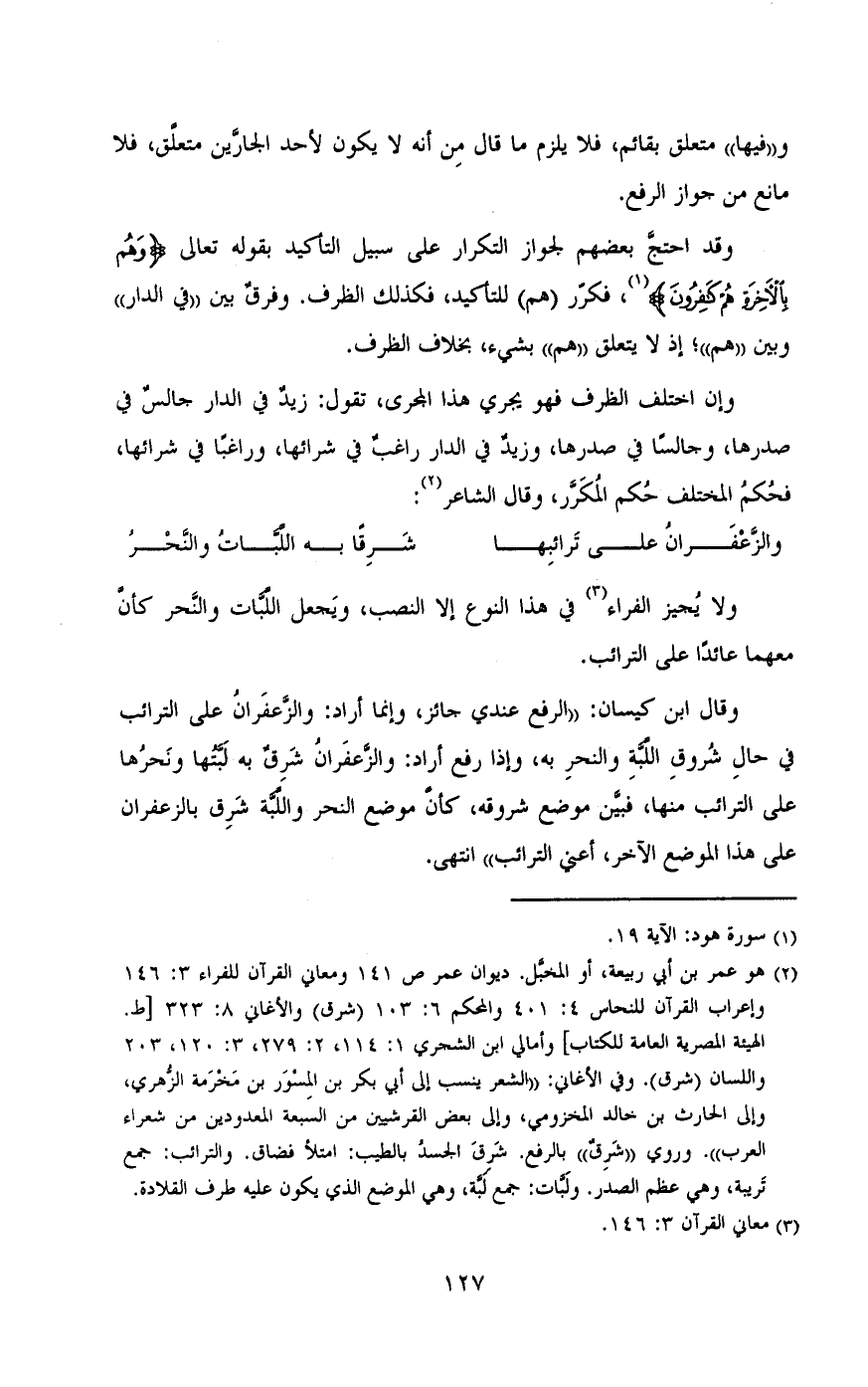 وقد احتج بعضهم لجواز التكرار على سبيل التأكيد بقوله تعالى (وهم بالاخرة هم كافرون) , فكرر (هم) للتاكيد , فكذلك الظرف. وفرق بين «في الدار» وبين «هم» إذ لا يتعلق «هم» بشيء , بخلاف الظرف.