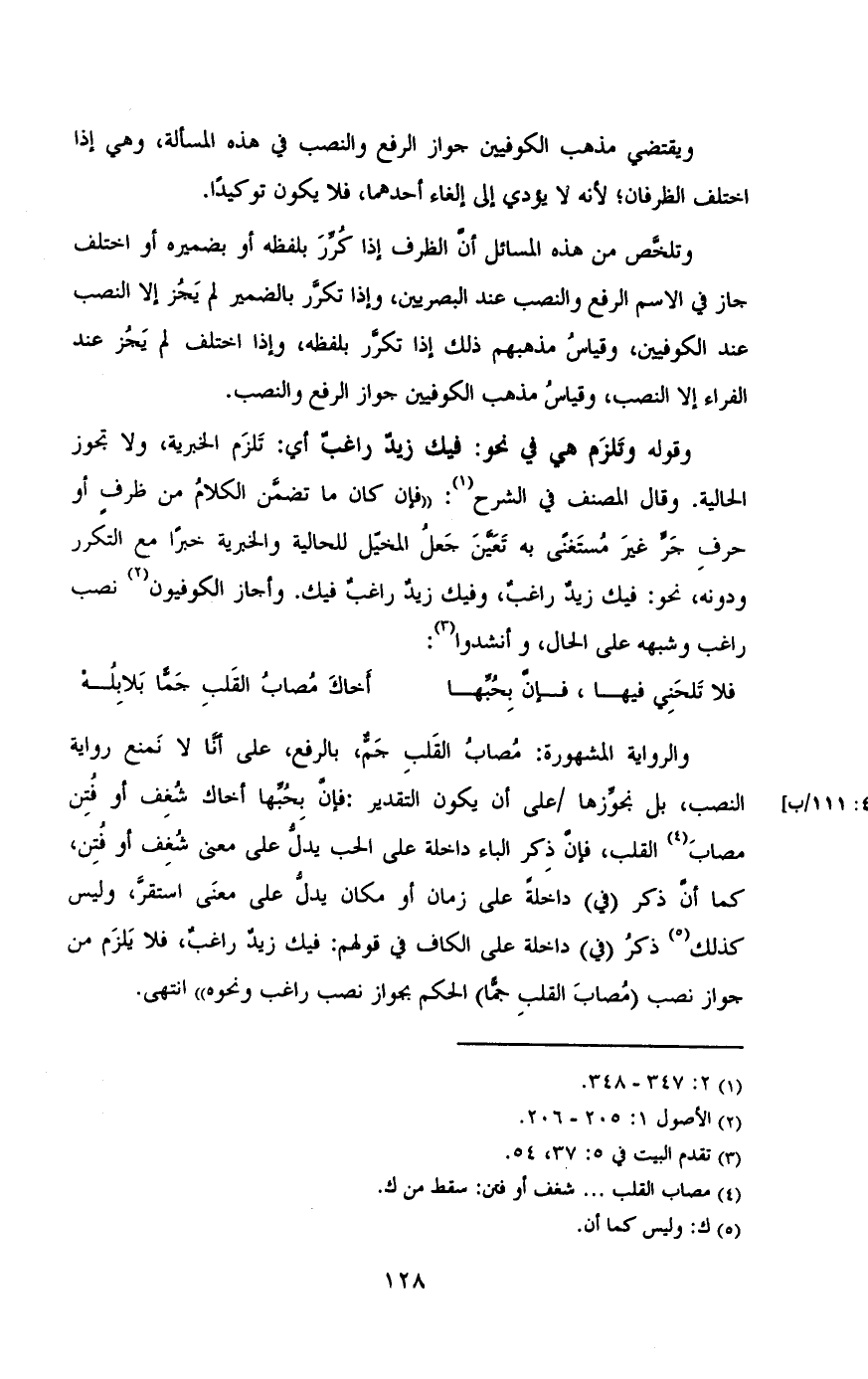 والرواية المشهورة: مصاب القلب جم , بالرفع , على أنا لا نمنع رواية النصب , بل نجوزها على أن يكون التقدير: فإن بحبها أخاك شغف أو فتن مصاب القلب , فإن ذكر الباء داخلة على الحب يدل على معنى شغف أو فتن , كما أن ذكر (فى) داخلة على زمان أو مكان يدل على معنى استقر , وليس كذلك ذكر (فى) داخلة على الكاف فى قولهم: فيك زيد راغب ونحوه» انتهى.