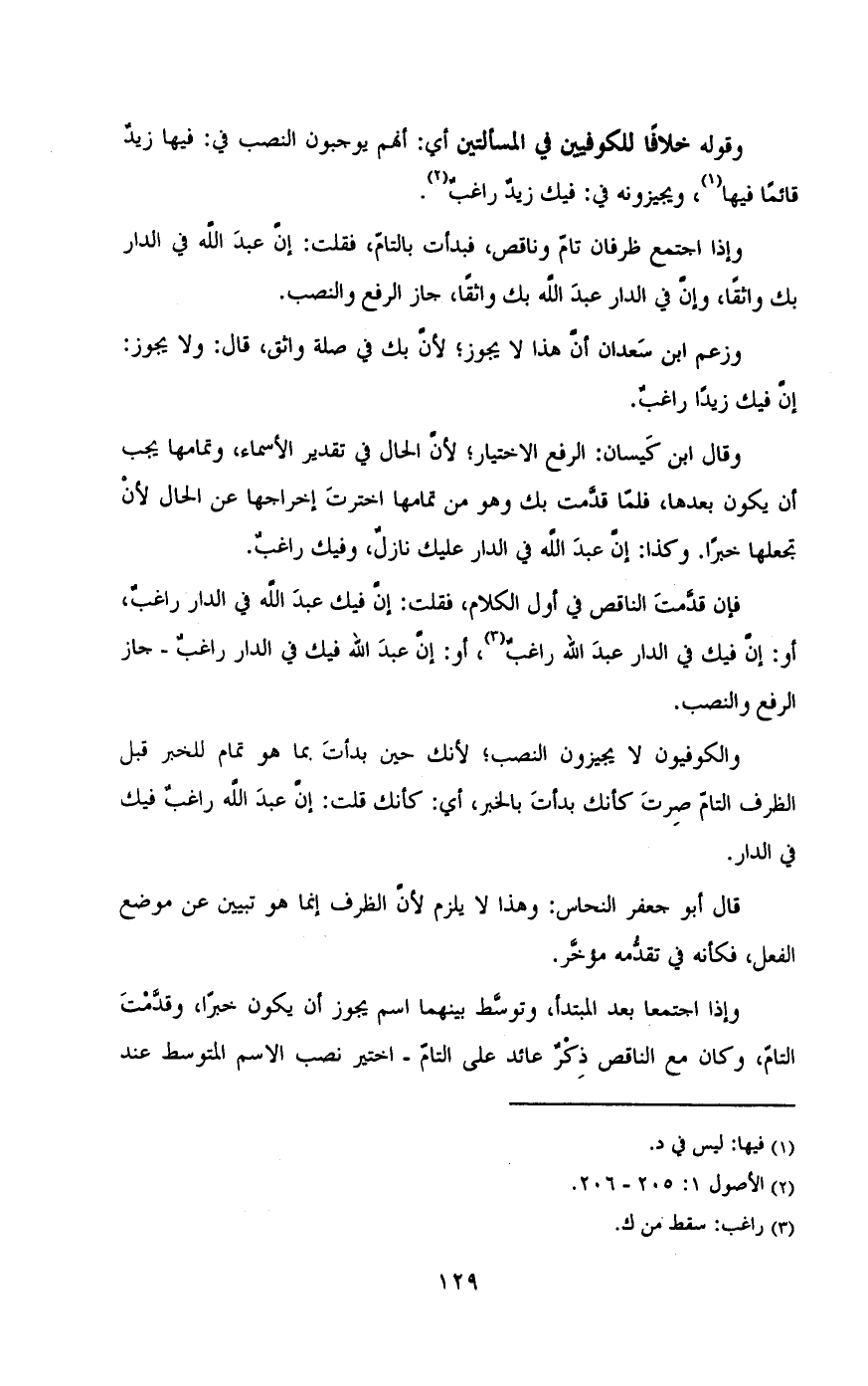 فإن قدمت الناقص فى أول الكلام , فقت: ان فيك عبدالله فى الدار راغب , أو ان فيك فى الدار عبدلله راغب , أو: إن عبدالله فيك فى الدار راغب - جاز الرفع والنصب.