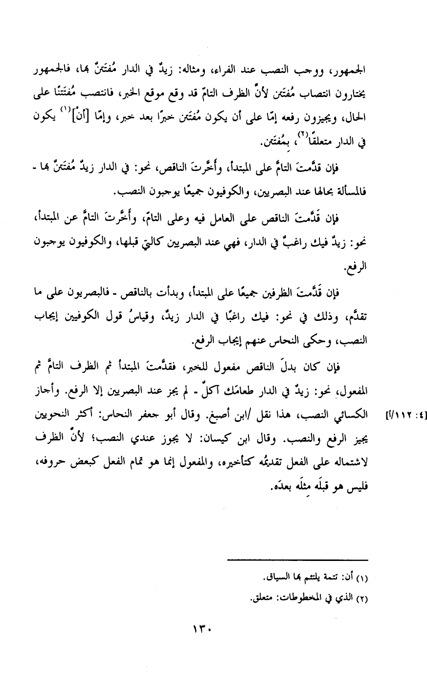 الجمهور , ووجب النصب عند الفراء , ومثاله: زيد فى الدار مفتن بها , فالجمهور يختارون انتصاب مفتنن لأن الظرف التام قد وقع موقع الخبر , فانتصب مفتتنا على الحال , ويجزيون رفعه , إما على أن يكون مفتنن خبرا بعد خبر , وإما» أن» يكون في الدار متعلقا , بمفتتن