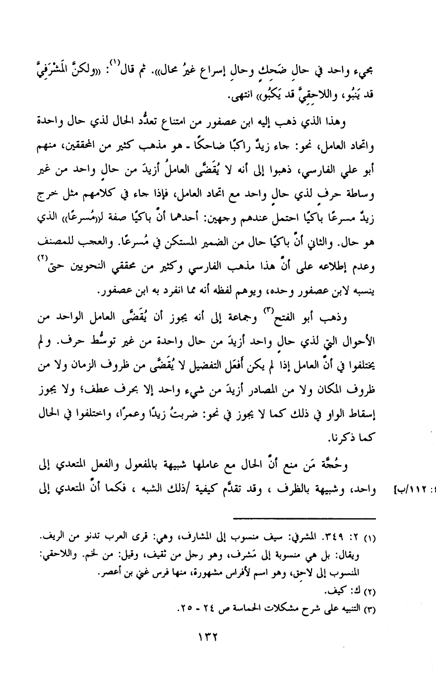 وهذا الذى ذهب إليه ابن عصفور من امتناع تعدد الحال لذى حال واحدة واتحاد العامل , نحو: جاء زيد راكبا ضاحكا - هو مذهب كثير من المحققين , منهم أبو على الفارسى , ذهبوا إلى أنه لا يقضى العامل أزيد من حال واحد من غير واسطة حرف لذى حال واحد مع اتحاد العامل , فإذا جاء فى كلامهم مثل خرج زيد مسرعاه باكيا احتمل عندهم وجهين أحدهما أن باكيا صفة ل «مسرعا» الذي هو حل. والثانى أن باكيا حال من الضمير المستكن فى مسرعا. والعجب للمصنف وعدم إطلاعه على أن هذا مذهب الفارسى وكثر من محققى النحويين حتى ينسبه لابن عصفور وحدة , ويوهم لفظه أنه مما انفرد به ابن عصفور.