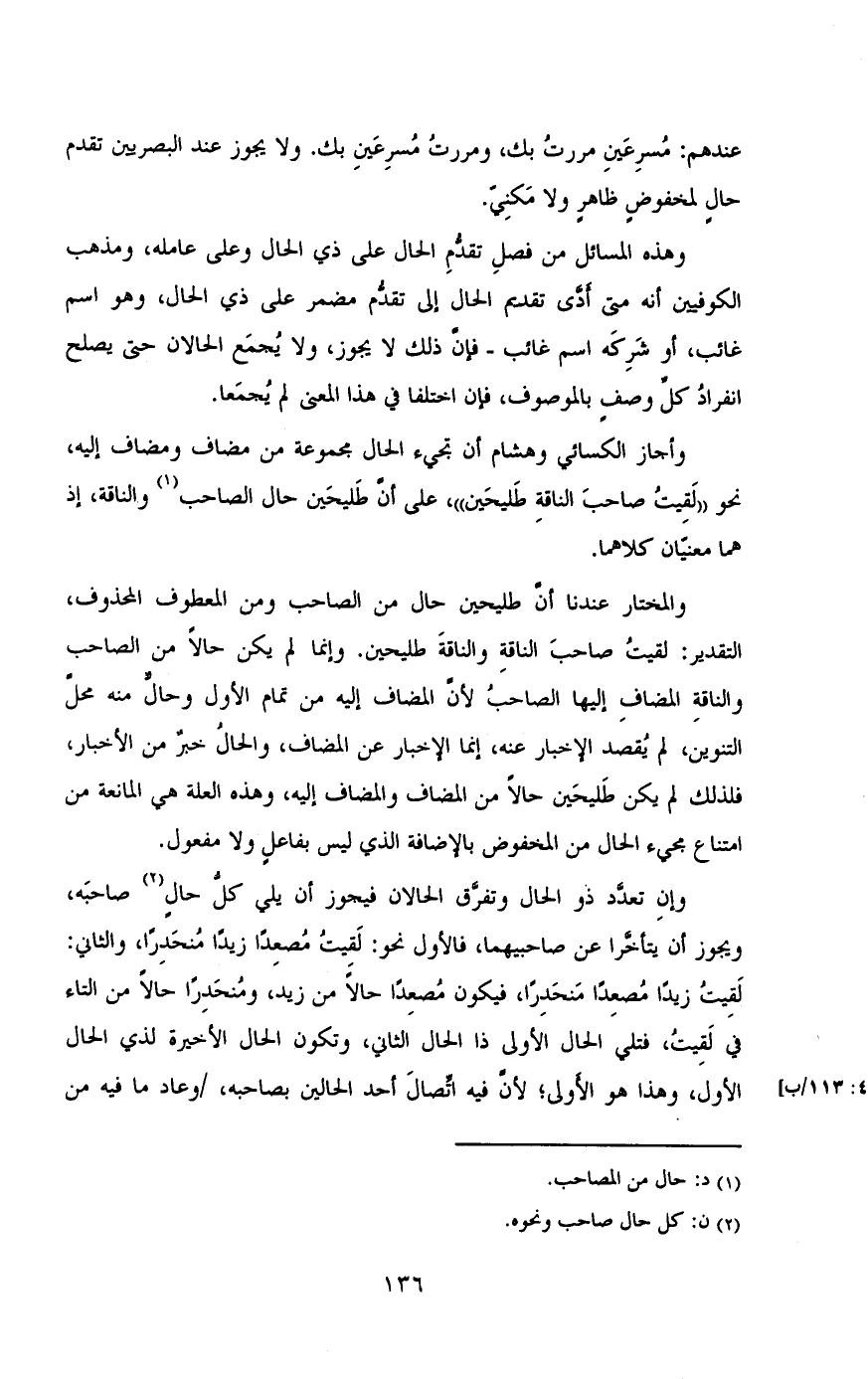 وجاز الكسائى وهشام أن تجئ الحال مجموعه من مضاف ومضاف إليه، نحو «لقيت صاحبه الناقة طليحين» على أن طليحين حال الصاحب والناقة، إذا هما معنيان كلاهما