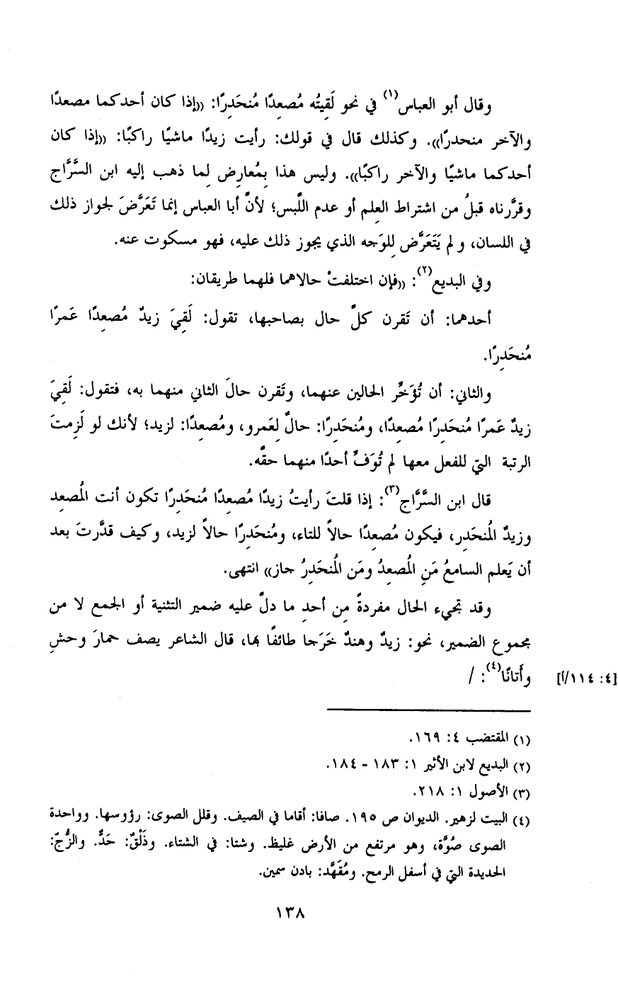 وقال أبو العباس في نحو لقيته مصعدا منحدرا» إذا كان احد كما مصعدا والأخر منحدرا»