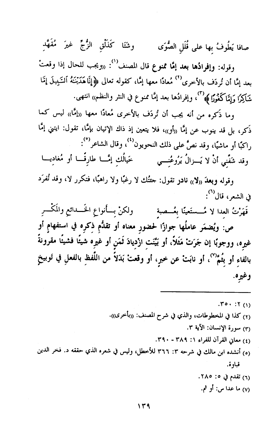 وقوله: وإفرادها بعد إما ممنوع قال المصنف: «ويجب للحال إذا وقعت بعد إما أن تردف بالأخرى معادا معها إما، كقوله تعالى «انا هديناه البيل اما شاكرا وإما كفورا»، وإفرادها بعد إما ممنوع في النثر والنظم» انتهي.