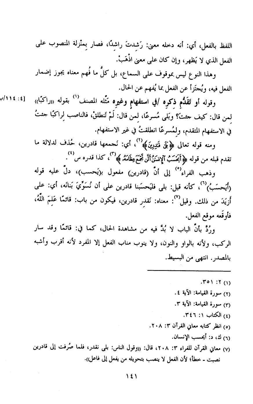 وذهب الفراء ال أن (قادرين) مفعول بـ (يحسب)، دل عليه قوله (أيحسب)، كأنه قيل: يلي فليحسبنا قادرين على أن نسوى بنانه، أي: على أزيد من ذلك. وقيل: معناه: نقدر قادرين، فيكون من باب: قائما علم الله فأوقعه موقع الفعل.