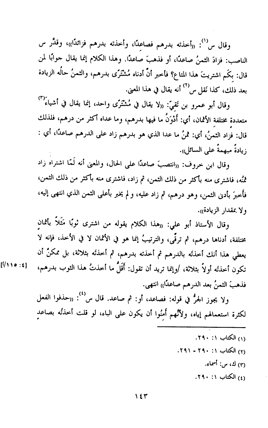 وقال س: «أخذته يدرهم فصاعدا، وأخذته بدرهم فزائدا»، وقدر س الناصب: فزاد الثمن صاعدا، أو فذهب صاعدا وهذا الكلام إنما يقال جوابا لمن قال: بكن اشتريت هذا المتاع؟ فأخير إن أدناه مشترى بدرهم، ما وعداه أكثر من درهم، فلذلك قال: فزاد الثمن، أي: ثمن ما عدا الذي هو بدرهم زاد على الدرهم صاعدا، أي: زيادة مبهمة على السائل».