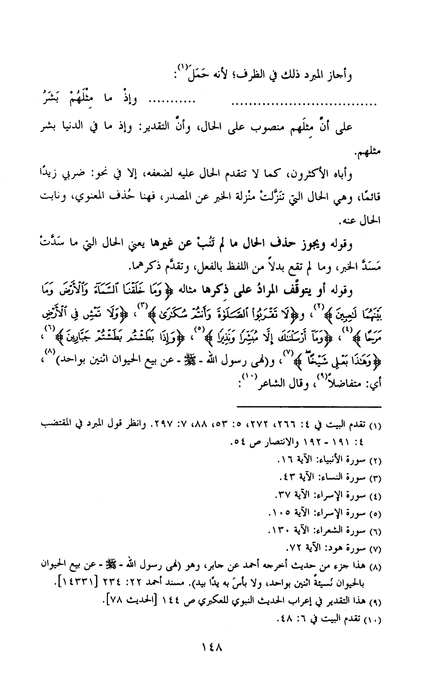 وقوله أو يتوقف المراد على ذكرها مثاله «وما خلقنا السماء والأرض وما بينهما لعين»، و «لا تقربوا الصلاة وانتم سكارى»، «ولا تمش في الأرض مرحا»، «وما أرسلناك إلا مبشرا ونذيرا»، «وإذا بطشتم بطشتم جبارين»، «وهذا بعلى شيخا»، و «هي رسول الله صلى الله عليه وسلم -عن بيع الحيوان اثنين بواحد»، أي: متفاضلا (٩ (، وقال الشاعر (١٠):