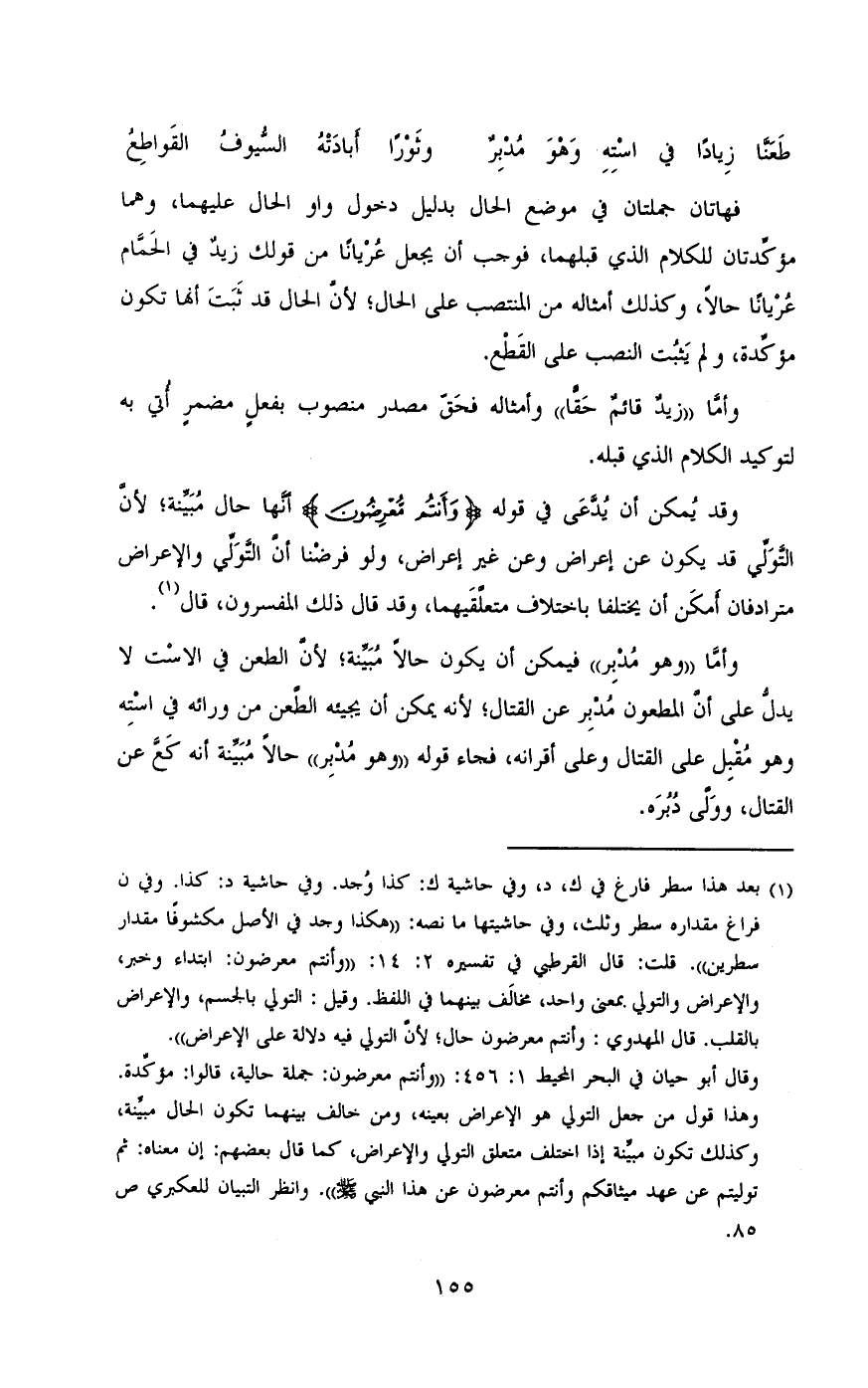 وقد يمكن أن يدعى في قوله} وأنتم معرضون {أنها حال مبينه , لأن التولي قد يكون عن أعراض وعن غير أعراض , ولو فرضنا أن التولي واٌلإعراض مترادفان أمكن أن يختلفا باختلاف متعلقيهما , وقد قال ذلك المفسرون , قال.