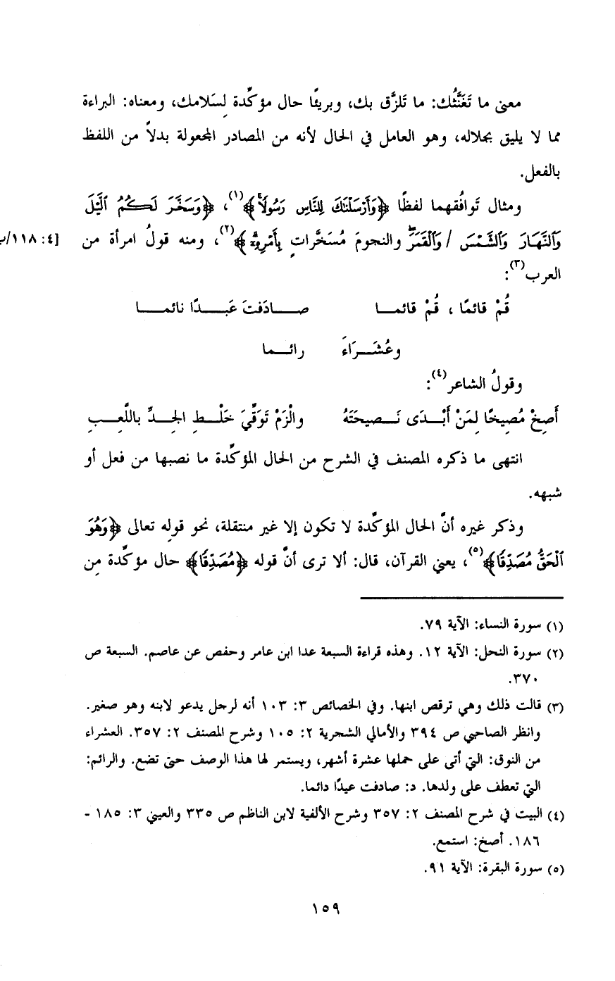 وذكر غيره أن الحال المؤكدة لا تكون إلا غير منتقلة , نحو قوله تعالى} وهو الحق مصدقاً {, يعنى القران , قال: ألا ترى أن قوله} مصدقاً {حال مؤكده من