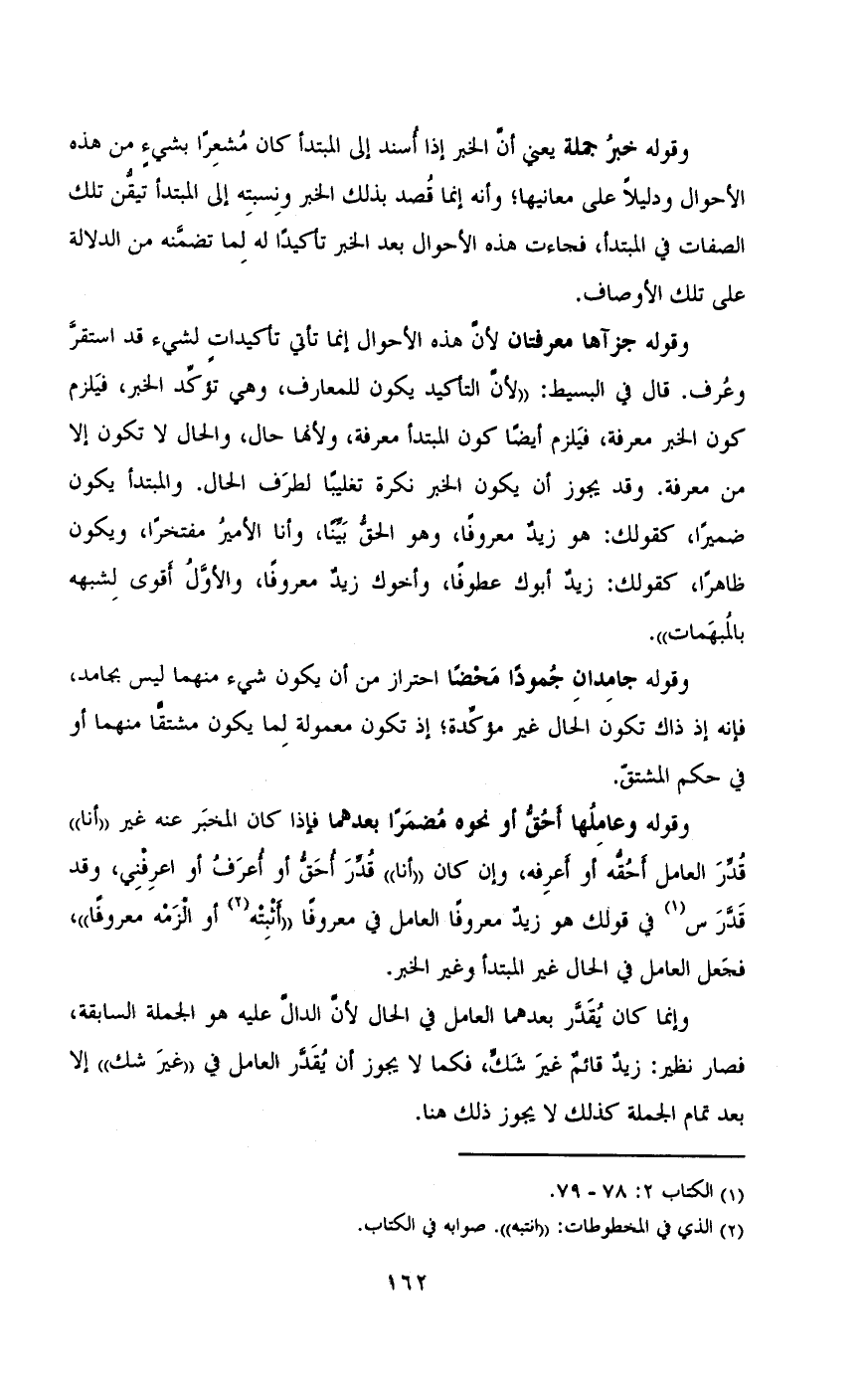 وقوله جزاها معرفتان لأن هذه الأحوال إنما تأتى تأكيدات لشيء قد استقر وعرف. قال في البسيط: «لأن التأكيد يكون للمعارف , وهى تؤكد الخبر , فيلزم كون الخبر معرفه , فيلزم أيضاً كون المبتدأ معرفه , ولأنها حال , والحال لا تكون إلا من معرفه. وقد يجوز أن يكون الخبر نكره تغليباً لطرف الحال. والمبتدأ يكون ضميراً , كقولك: هو زيدُ معروفاً , وهو الحق بينا , وأنا الأمير مفتخراً , ويكون ظاهراً , كقولك: زيد أبوك عطوفاً , وأخوك زيد معروفاً , والأول أقوى لشبهه بالمبهمات».