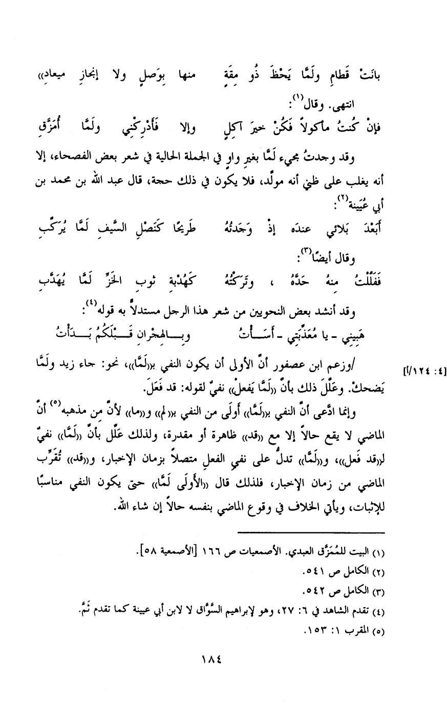 وقد وجدت مجيء لما بغير واو في الجملة الحالية في شعر بعض الفصحاء , إلا أنه يغلب على ظني أنه مولد , فلا يكون في ذلك حجه , قال عبد الله بن محمد بن أبى عيينة:
