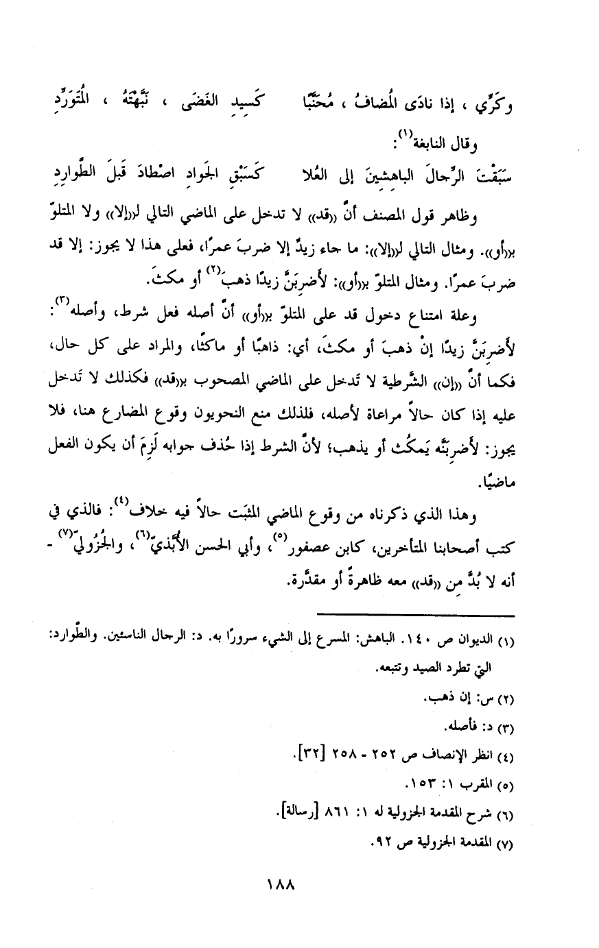 ب «أو». ومثال التالي ل «إلا»: ما جاء زيد إلا ضرب عمرا، فعلى هذا لا يجوز إلا قد ضرب عمرا. ومثال المتلو ب «أو» لأضربن زيدا ذهب إو مكث.