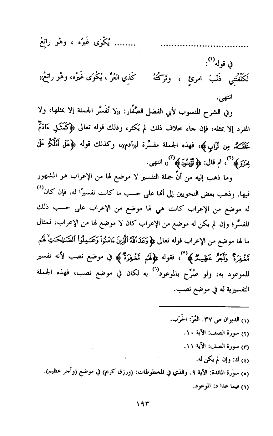 وفى الشرح المنسوب لأبي الفضل الصفار: ««لا تفسر الجملة إلا بمثلها، ولا المفرد إلا بمثله، فإن جاء خلاف ذلك لم يكثر، وذلك قوله تعالى «لا تفسر الجملة إلا بمثلها، ولا المفرد إلا بمثله، فان جاء خلاف ذلك لم يكثر، وذلك قوله تعالى