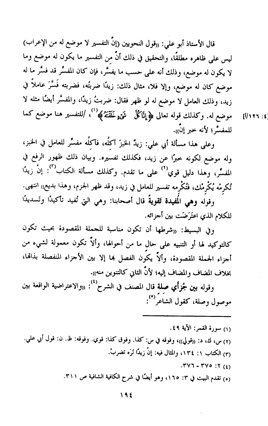 قال الأستاذ أبو علي: «قول النحويين (إن التفسير لا موضع له من الإعراب) ليس على ظاهرة مطلقة، والتحقيق في ذلك أن من التفسير ما يكون له موضع وما لا يكون له موضع، وذلك أنه على حسب ما يفسر، فإن كان المفسر قد فسر ما له موضع كان له موضع، وإلا فلا، مثال ذلك: زيدا ضربته، فضربته فسر عاملا في زيد، وذلك العامل لا موضع له لو ظهر فقال: ضربت زيدا، والمفسر أيضا مثله لا موضع له. وكذلك قوله تعالى {{إِنَّا كُلَّ شَيْءٍ خَلَقْنَاهُ بِقَدَرٍ} [القمر:٤٩]