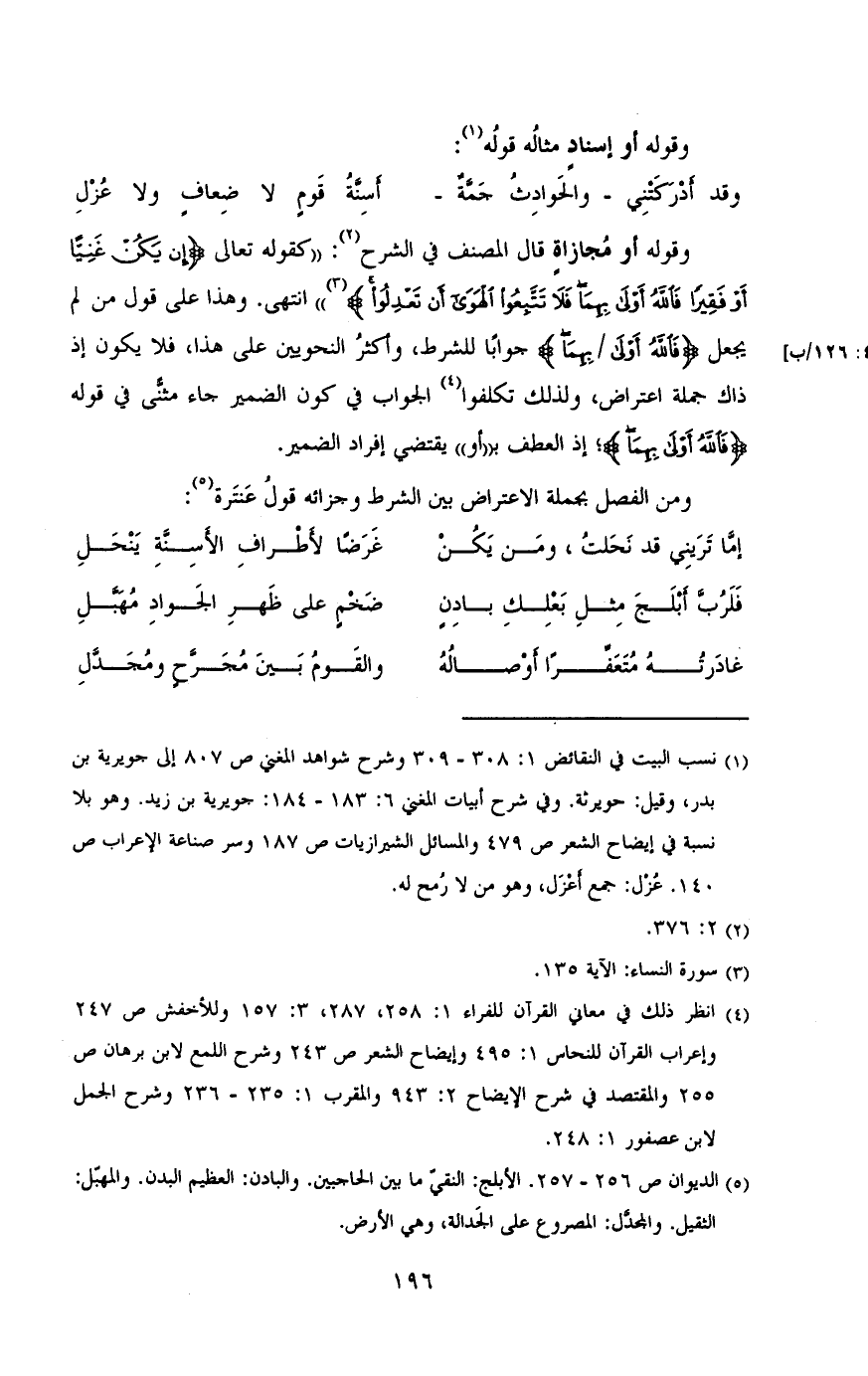 وقوله أو مجازاة قال المصنف في الشرح: «كقوله تعالى {إِنْ يَكُنْ غَنِيًّا أَوْ فَقِيرًا فَاللَّهُ أَوْلَى بِهِمَا فَلا تَتَّبِعُوا} انتهى. وهذا على قول من لم يجعل {فالله أولى / بهما} جواباً للشرط، وأكثر النحويين على هذا، فلا يكون إذ ذاك جملة اعتراض، ولذلك تكفوا الجواب في كون الضمير جاء مثنى في قوله {فالله أولى بهما}،إذ العطف ب «أو» يقتضى إفراد الضمير.