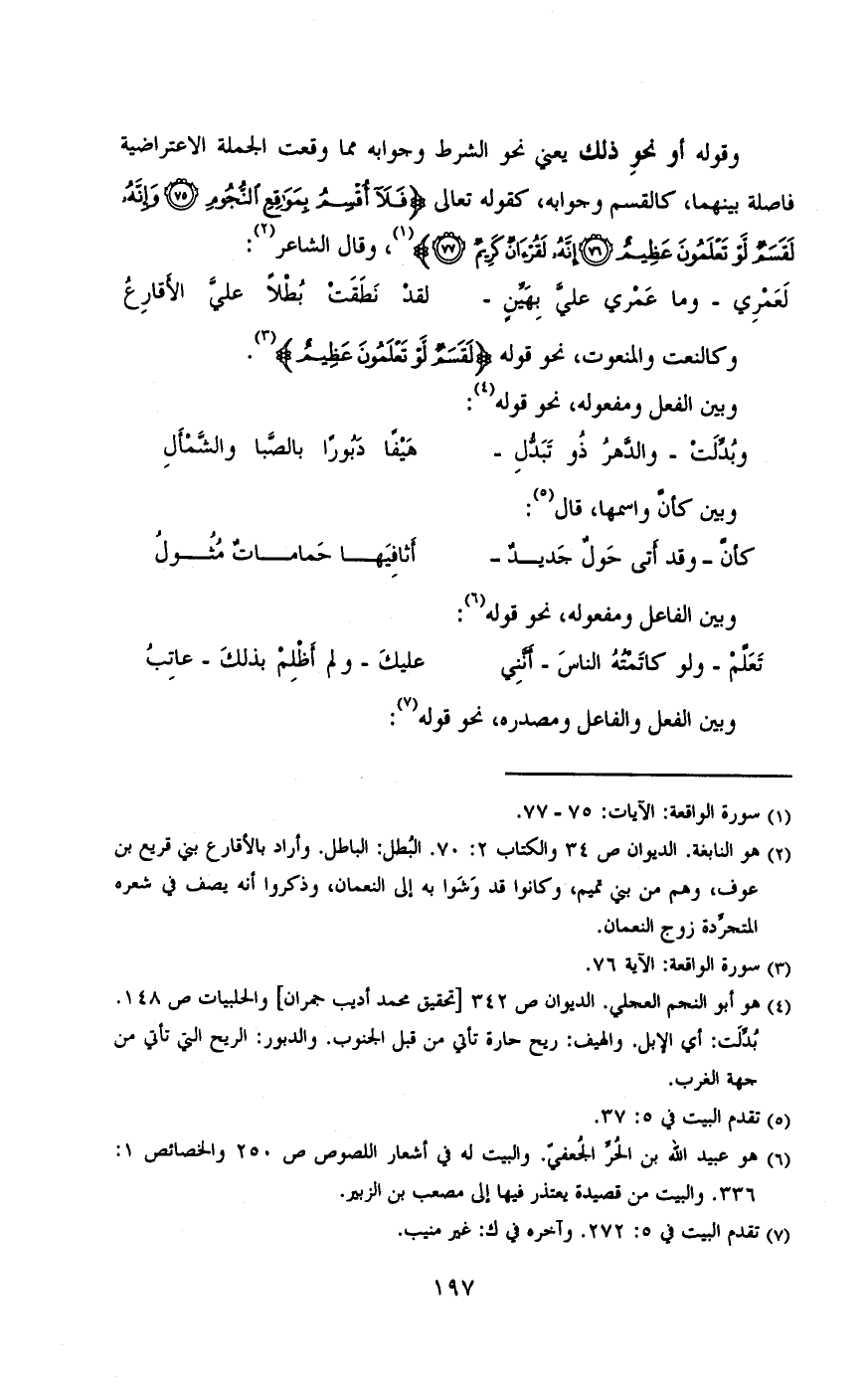 وقوله أو نحو ذلك يعني نحو الشرط وجوابه مما وقعت الجملة الاعتراضية فاصلة بينهما، كالقسم وجوابه، كقوله تعالى {فَلا أُقْسِمُ بِمَوَاقِعِ النُّجُومِ} [الواقعة:٧٥] {وَإِنَّهُ لَقَسَمٌ لَوْ تَعْلَمُونَ عَظِيمٌ} [الواقعة:٧٦] {إِنَّهُ لَقُرْآنٌ كَرِيمٌ} [الواقعة:٧٧]