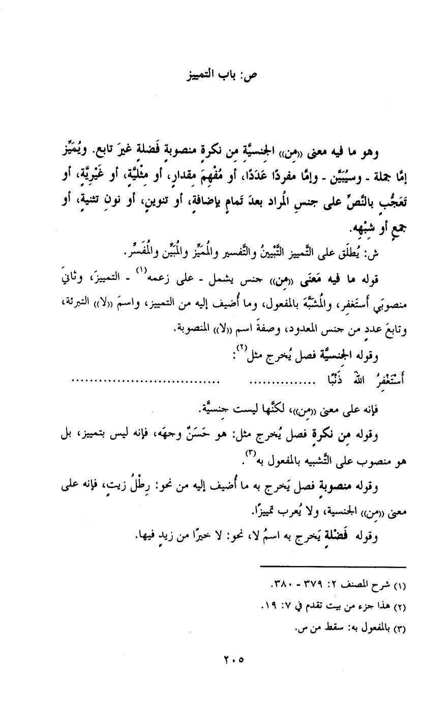 وهو ما فيه معني (من) الجنسيه من نكره منصوبه فضله غير متابع. ويميز اما جمله -وسيبين - اما مفردا عددا فتح , او مفهم مقدار ' او مثليه او غيريه او تعجب بالنص علي جنس المراد بعد تمام باضافه , او تنوين , أو نون تثنيه , أو جمع أو شبه.]-