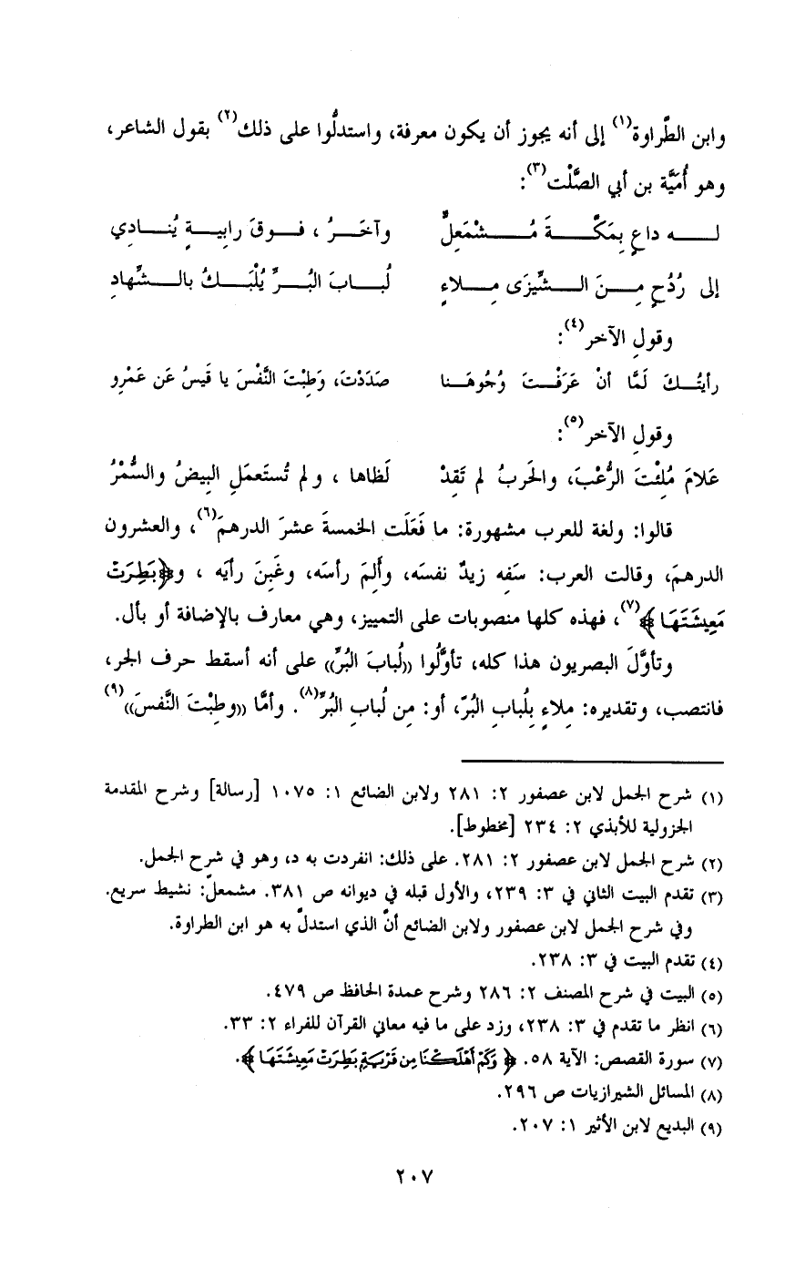 قالو: ولغه للعرب مشهوره: مافعلت الخمسه عشره دراهم , والعشرون الدرهم , وقالت العرب: سفه زيد نفسه , وألم رأسه , وغبن رأيه , و (وبطرت معيشتها) , فهذه , كلها منصوب علي التمييز , وهو ومعارف معارف بالاضافه او بأل.