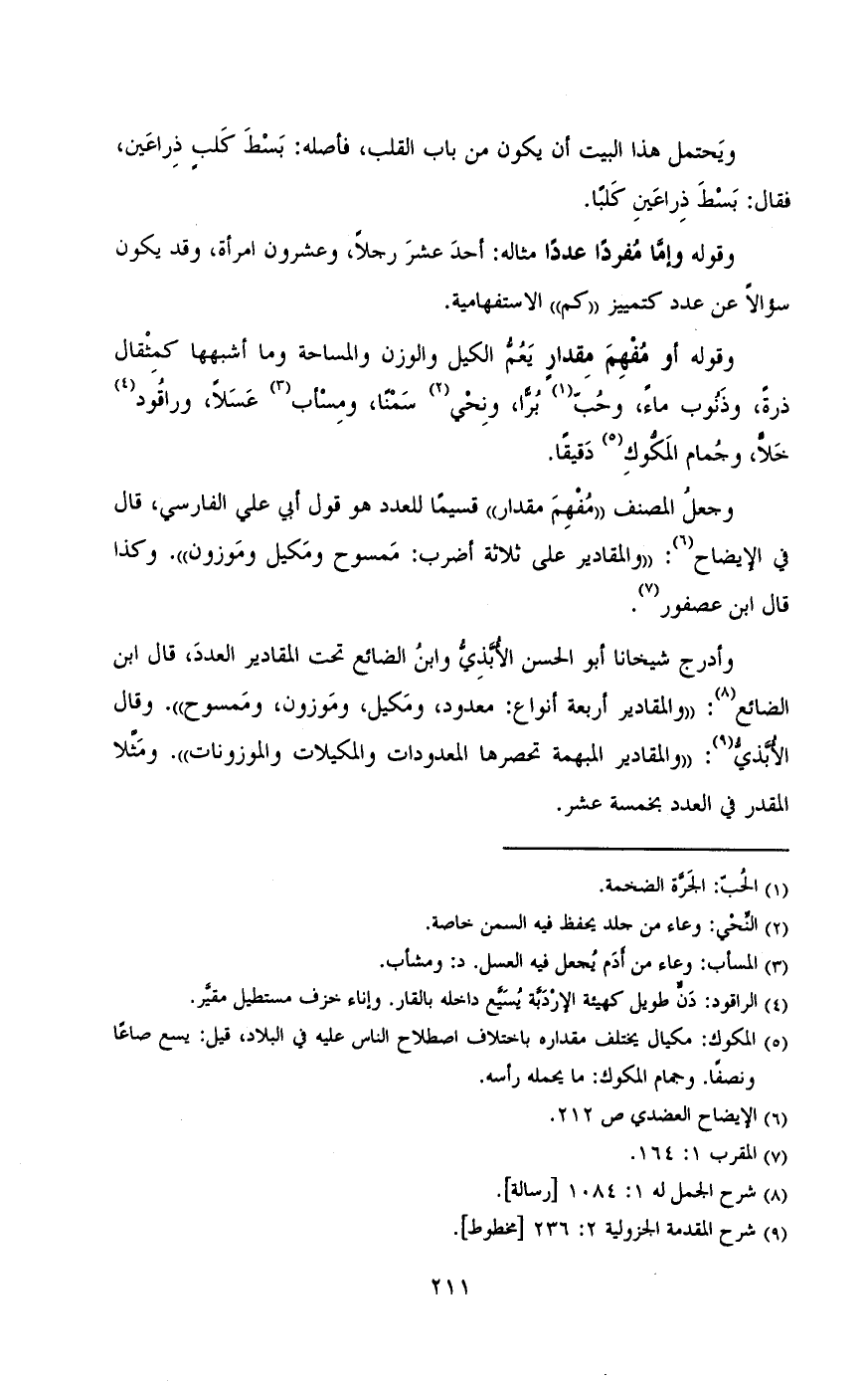 وجعل المصنف (مفهم مقدار) هو قول ابي علي الفارسي , وقال في الايضاح: (والمقادير علي ثلاثه اضرب: مسموح ومكيل وموزون) وكذا قال ابن عصفور.