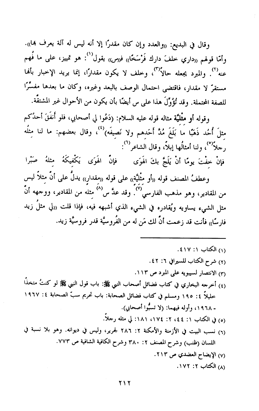 اما قولهم (داري خلف دارك فرسخا) ف (س) يقول: هو تمييز علي مافهم عنه. والمبرد يجعله حالا , وخلف لا يكون مقدارا , انما يريد الاخبار بانها مستقر لا مقدار , فاقتضي احتمال الوصف بالبعد وغيره , وكان ما بعدها مفسرا للصفه المحتمله. وقد تؤول هذا علي س ايضا بأن يكون من الاحوال غير المشتقه.