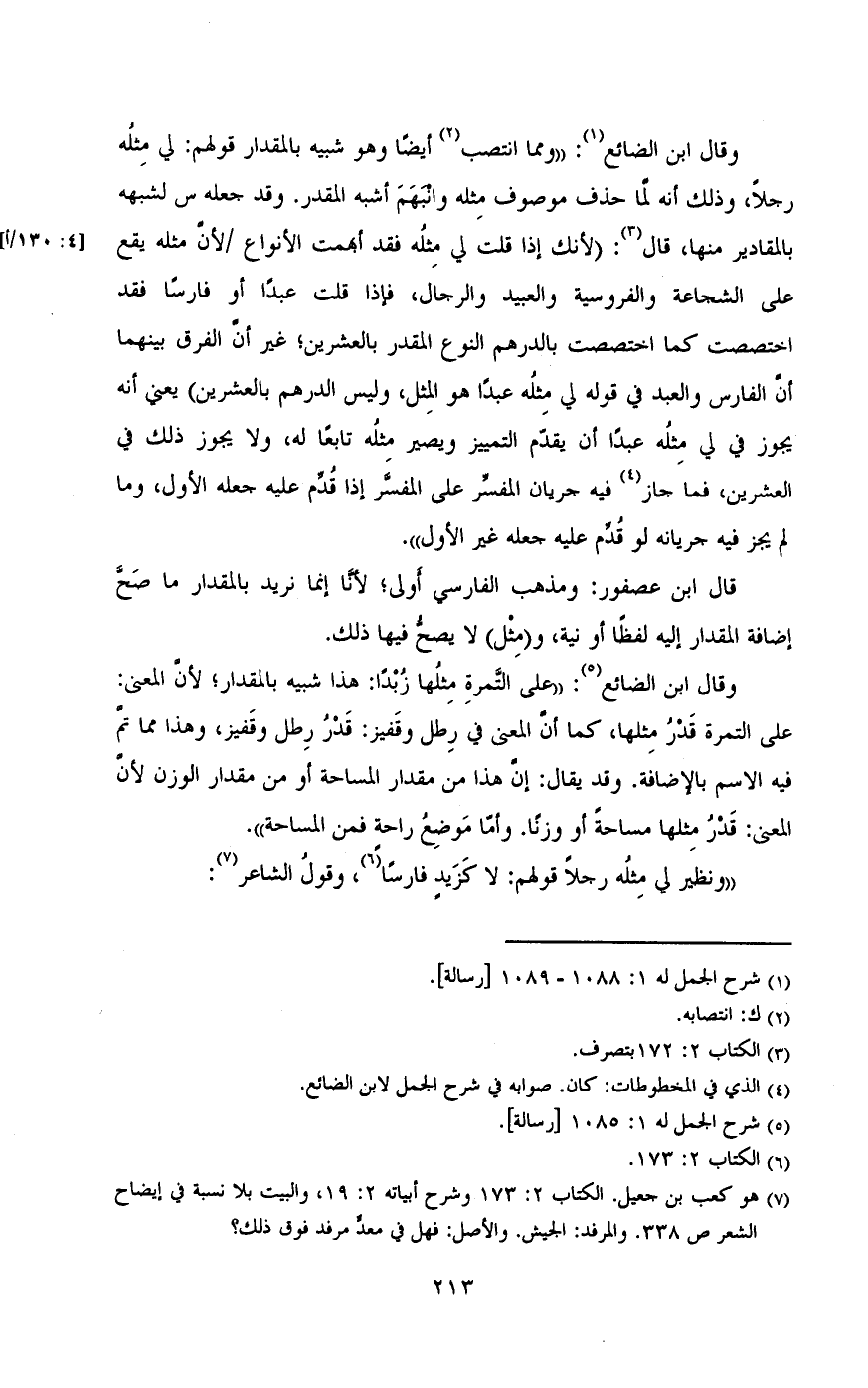 وقال ابن الضائع: «وعلي التمره مثلها زبدا: هذا شبيه بالمقدار لان المعني: علي التمره قدر مثلها , كما ان المعني في رطل وقفيز: قدر رطل وقفيز , وهذا مما تم فيه الاسم بالاضافه. وقد يقال: ان هذا من مقدار المساحه أو من مقدار الوزن لأن المعني: قدر مثلها ومساحه او وزنا. واما موضع راحه فمن المساحه»