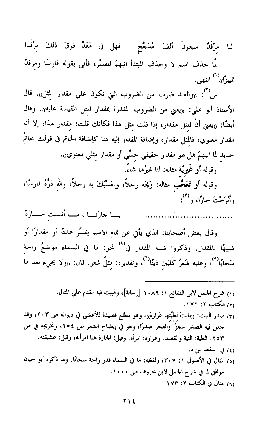 الاستاذ ابو علي «يعني من الضرب المقدره بمقدار المثل المقيسه عليه». وقال ايضا: (يعني ان المثل مقدار , اذا قلت مثل هذا فكانك قلت: مقدار هذا , الا نه مقدار معنوي , فالمثل مقدار, واضافه المقدار اليه هنا كاضافه الخاتم في قولك خاتم حديد لما انبهم هل هو مقدار حقيقي حسي أو مقدار حقيقي حسياو مقدار مثلي معنوي».