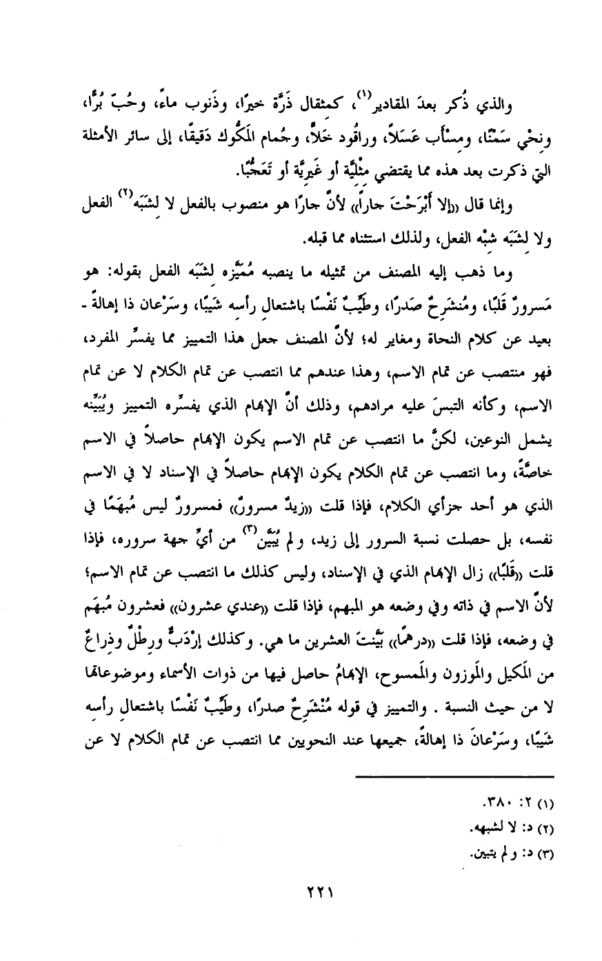 وما ذهب إليه المصنف من تمثيله ما ينصبه مميزة لشبه الفعل بقولة: هو مسرور قلبا، ومنشرح صدرا، وطيب نفسا باشتعال رأسه شيبا، وسرعان ذا إهالة - بعيد عن كلام النحاة ومغاير له، لأن المصنف جعل هذا التمييز مما يفسر المفرد، فهو منتصب عن تمام الاسم، وهذا عندهم مما انتصب عن تمام الكلام لا عن تمام الاسم، وكأنه التبس عليه مرادهم، وذلك أن الإبهام الذي يفسره التمييز ويبينه يشمل النوعين، لكن ما انتصب عن تمام الاسم يكون الإبهام حاصلا في الاسم خاصة، وما انتصب عن تمام الكلام يكون الإبهام حاصلا في الإسناد لا في السم الذي هو أحد جزأي الكلام، فإذا قلت «زيد مسرور» فمسرور ليس مبهما في نفسه، بل حصلت نسبة السرور إلي زيد، ولم يبين من أي جهة سروره، فإذا قلت «قلبا» زال الإبهام الذي في الإسناد، وليس كذلك ما انتصب عن تمام الاسم، لأن الاسم في ذاته وفي وضعه هو المبهم، فإذا قلت «عندي عشرون» فعشرون مبهم في وضعه، فإذا قلت «درهما» بينت العشرين ما هي. وكذلك إردب ورطل وذراع من المكيل والموزون والمسموح، الإبهام حاصل فيها من ذوات الأسماء وموضوعاتها من حيث النسبة. والتمييز في قوله منشرح صدرا، وطيب نفسا باشتعال رأسه شيبا، وسرعان ذا إهالة، جميعها عند النحويين مما انتصب عن تمام الكلام لا عن