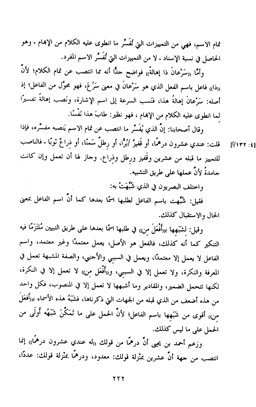 وقال أصحابنا: إن الذي يفسر ما انتصب عن تمام الاسم ينصبه مفسره، فإذا قلت: عندي عشرون درهما، أو قفيز /برا، أو رطل سمنا، أو ذراع ثوبا - فالناصب للتمييز ما قبله من عشرين وقفيز ورطل وذراع. وجاز لها أن تعمل وإن كانت جامدة لأن عملها على طريق التشبيه.