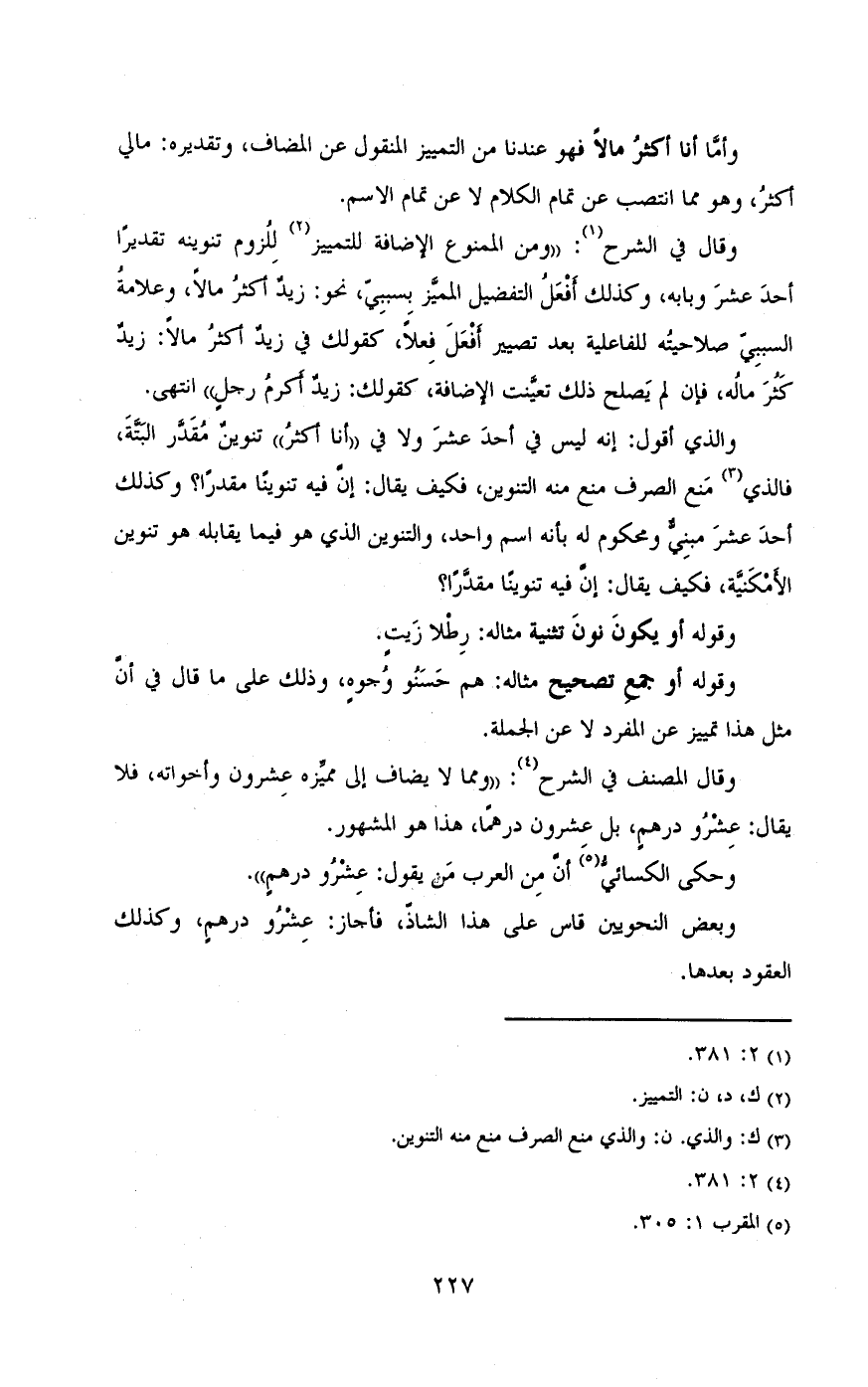 والذي أقول: إنه ليس في أحد عشر ولا في «أنا أكثر» تنوين مقدر البتة، فالذي منع الصرف منع منه التنوين، فكيف يقال: إن فيه تنوينا مقدرا؟ وكذلك أحد عشر مبني ومحكوم له بأنه اسم واحد، والتنوين الذي هو فيما يقابله هو تنوين الأمكنية، فكيف يقال: إن فيه تنوينا مقدرا؟