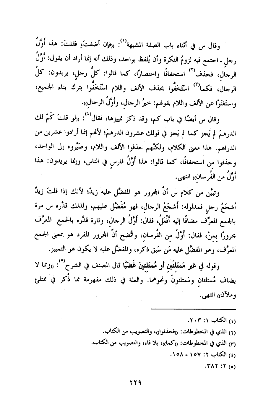 وقال س أيضا في باب كم، وقد ذكر تمييزها، فقال: «لو قلت كم لك الدرهم لم يجز كما لم يجز في قولك عشرون الدرهم، لأنهم إنما أرادوا عشرين من الدراهم. هذا معنى الكلام، ولكنهم حذفوا الألف واللام، وصيروه إلي الواحد، وحذفوا من استخفافا، كما قالوا: هذا أول فارس في الناس، وإنما يريدون: هذا أول من الفرسان» انتهى.