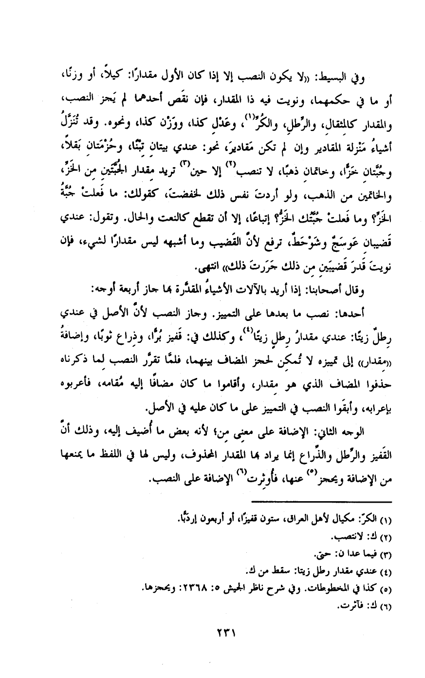أحدها: نصب ما بعدها على التمييز. وجاز النصب لأن الأصل في عندي رطل زيتا: عندي مقدار رطل زيتا، وكذلك في: قفيز برا، وذراع ثوبا، واضافه «مقدار» إلى تمييزه لا تمكن لحجز المضاف بينهما، فلما تقرر النصب لما ذكرناه حذفوا المضاف الذي هو مقدار، وأقاموا ما كان مضافا اليه مقامه، فأعربوه بإعرابه، وأبقوا النصب في التمييز علي ما كان عليه في الأصل.