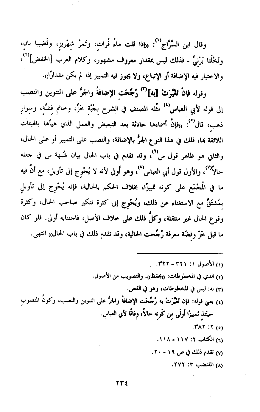 وقوله فإن تغيرت (به) رجحت الإضافة والجر علي التنوين والنصب إلى قوله لأبي العباس مثله المصنف في الشرح بجبة خز، وخاتم فضة، وسوار ذهب، قال: «فإن أسماءها حادثة بعد التبعيض والعمل الذي هيأها بالهيئات اللائقة بها، فلك في هذا النوع الجر بالإضافة، والنصب علي التمييز أو علي الحال، والثاني هو ظاهر قول س، وقد تقدم في باب الحال بيان شبهة س في جعله حالا، والأول قول أبي العباس، وهو أولي لأنه لا يحوج إلي تأويل. مع أن فيه ما في المجمع علي كونه تمييزا، بخلاف الحكم بالحالية، فإنه يحوج إلي تأويل بمشتق مع الاستغناء عن ذلك، ويحوج إلي كثره تنكير صاحب الحال، وكثرة وقوع الحال غير متنقلة، وكل ذلك علي خلاف الأصل، فاجتنابه أولي. فلو كان ما قبل خز وفضة معرفو رجحت الحالية، وقد تقدم ذلك في باب الحال» انتهى.