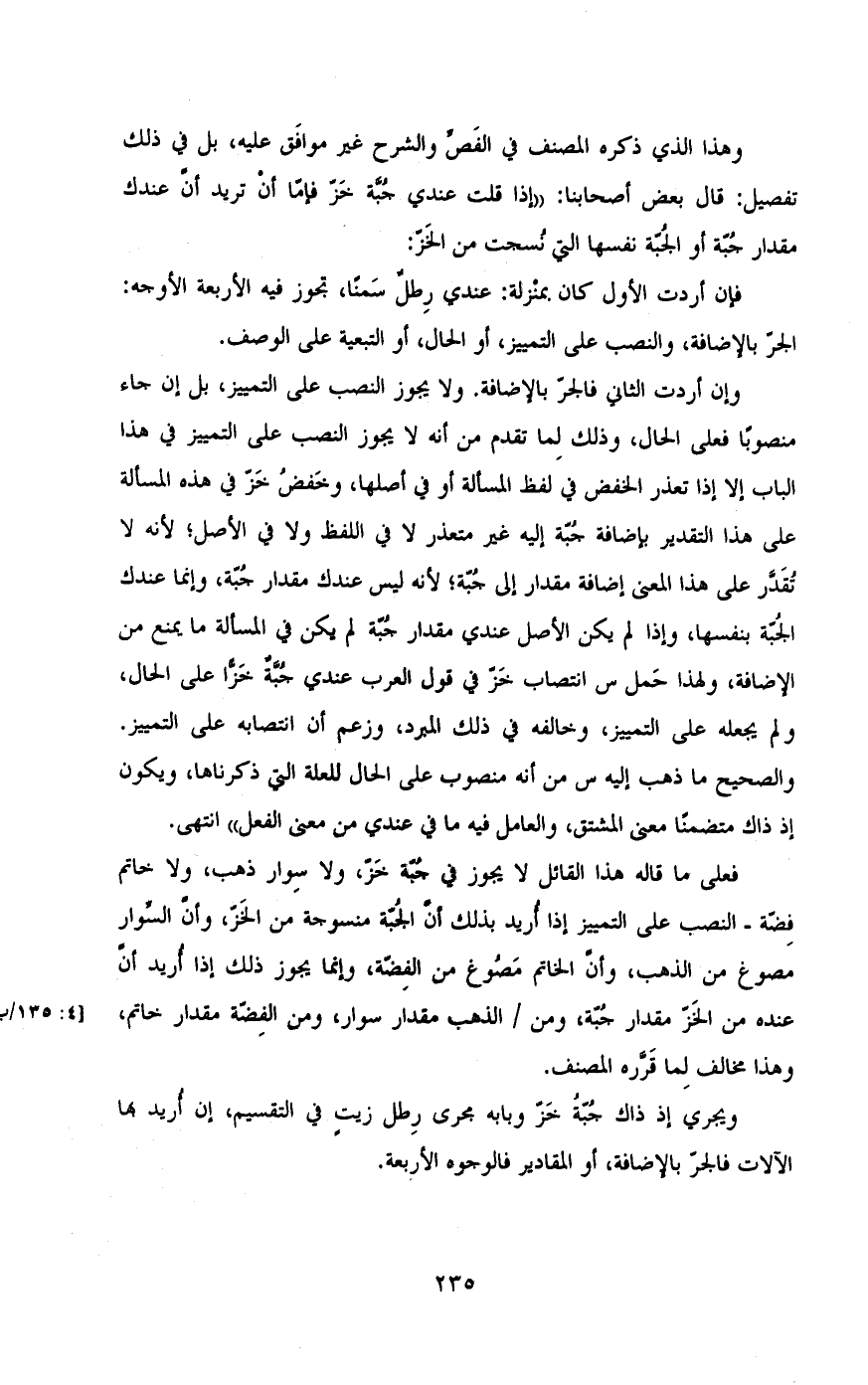 وهذا الذي ذكره المصنف في الفص والشرح غير موافق عليه، بل في ذلك تفصيل: قال بعض اصحابنا: «إذا قلت عندي جبة خز فإما أن تريد أن عندك مقدار جبة او الجبة نفسها التي نسجت من الخز:
