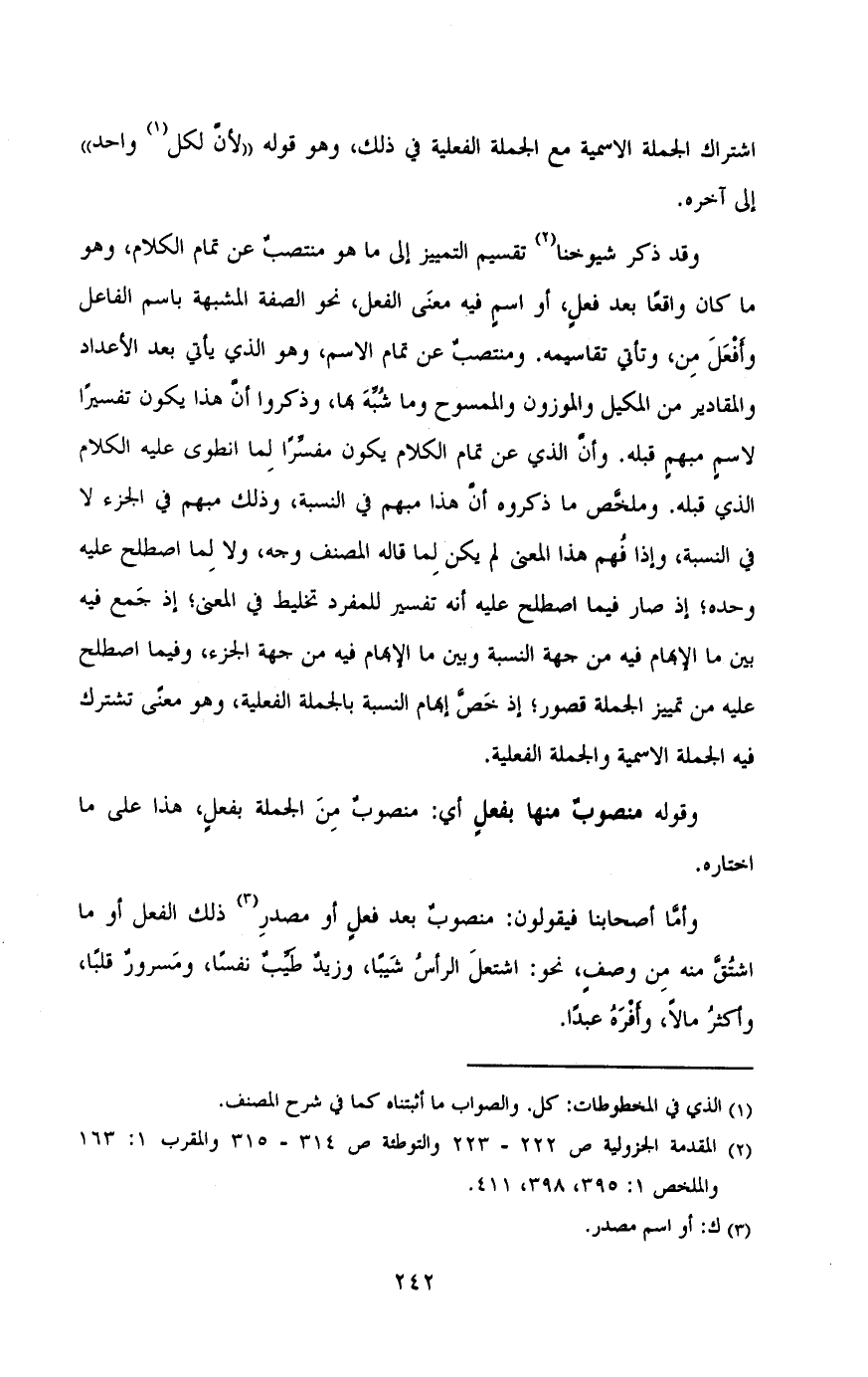 وأما اصحابنا فيقولون: منصوب بعد فعل أو مصدر ذلك الفعل أول ما اشتق منه من وصف، نحو: اشتعل الرأس شيبا، وزيد طيب نفسا، ومسرور قلبا، وأكثر مالا، وأفره عبدا.