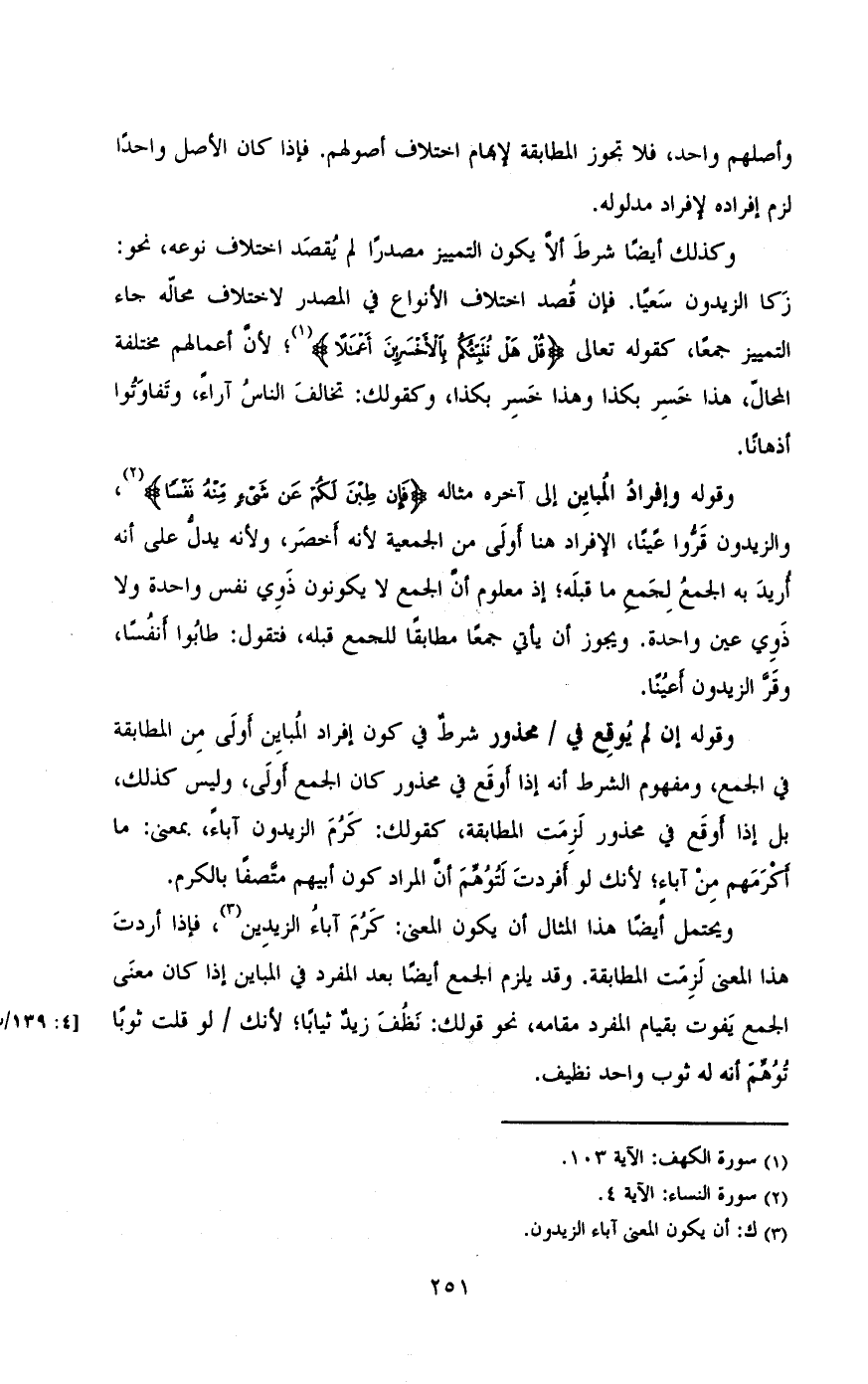 ويحتمل أيضا هذا المثال أن يكون المعني: كرم آباء الزيدين، فإذا أردت هذا المعني لزمت المطابقة. وقد يلزم الجمع أيضا بعد المفرد في المباين إذا كان معني الجمع يفوت بقيام المفرد مقامه، نحو قولك: نظف زيد ثيابا، لأنك/ لو قلت ثوبا توهم أنه له ثوب واحد نظيف.
