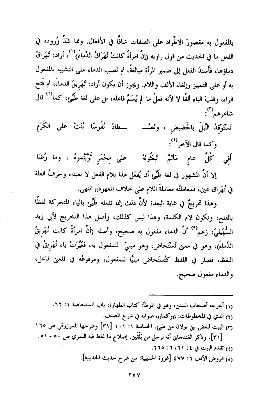 وهذا تخريج في غاية البعد، لأن ذلك إنما تفعله طيئ بالياء المتحركة لفظا بالفتح، وتكون لام الكلمة، وهذا ليس كذلك، واصل هذا التخريج لأبي زيد السهيلي، زعم أن الدماء مفعول به صحيح، وأصله (أن امرأه كانت تهريق الدماء)، وهو في معني تستحاض، وهو مبني للمفعول به، فغسرت ياء تهريق في اللفظ فصار في اللفظ كتستحاض مبنيا للمفعول، ومرفوعه في المعني فاعل، والدماء مفعول صحيح.