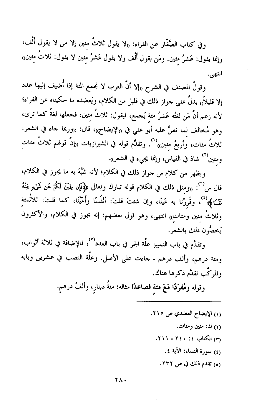 ثلاث مئات واربع مئين" وتقدم قوله فى الشيرازيات "ان قولهم ثلاث مئات ومئين شاذ فى القياس وانما يجئ فى الشعر"