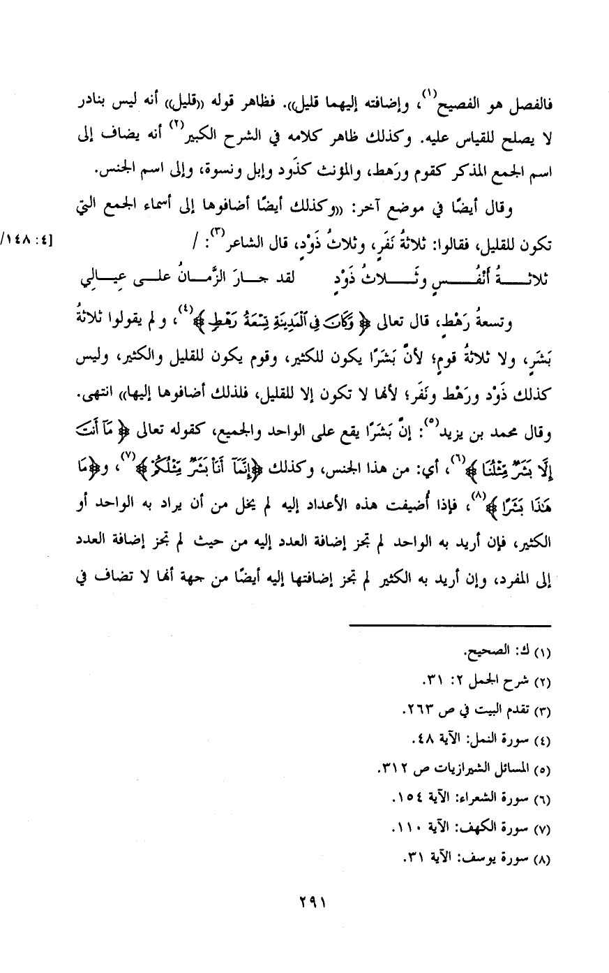 فالفصل هو الفصيح، واضافتة اليهما قليل. فظاهر قولة «قليل» انة ليس بنادر لايصلح للقياس علية وكذلك ظاهر كلامة فى الشرح الكبير انة يضاف الى اسم الجمع المذكر كقوم ورهط، والمؤنث كذود وابل ونسوة، والى اسم الجنس. وقال ابضا فى موضع اخر: «وكذلك ايضا اضافوها الى اسماء الجمع التى تكون للقليل، فقالوا: ثلاثة نفر، وثلاثة ذود، قال الشاعر: