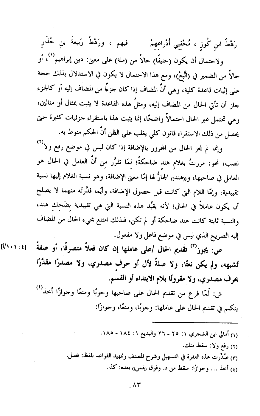 ولاحتمال أن يكون (حنيفاً) حالاً من (مله) على معنى: دين إبراهيم , أو حالاً من الضمير في (اتبع) ومع هذا الاحتمال لايكون في الاستدلال بذلك حجة على إثبات قاعدة كلية , وهى أن المضاف إذا كان جزءاً من المضاف إليه أو كالجزء جاز أن تأتى الحال من المضاف إليه , ومثل هذه القاعدة لا يثبت بمثال أو مثالين , وهى تحتمل غير الحال احتمالا واضحا , إنما يثبت هذا باستقراء جزيئات كثيرة حتى يحصل من ذلك الاستقراء قانون كلى يغلب على الظن أن الحكم منوط به.