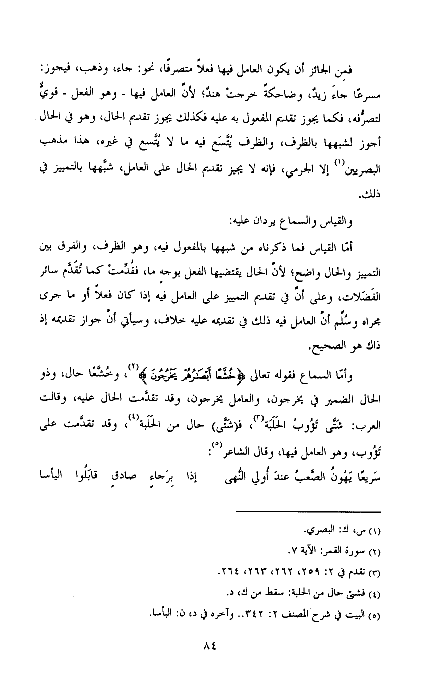 وأما السماع فقوله تعالى (خشعاً أبصرهم يخرجون) وخشعاً حال , وذو الحال الضمير في يخرجون , والعامل يخرجون , وقد تقدمت الحال عليه , وقالت العرب: شتى تؤوب الحلبة , (فـ (شتى) حال من الحلبة , وقد تقدمت على تؤوب , وهو العامل فيها , وقال الشاعر: