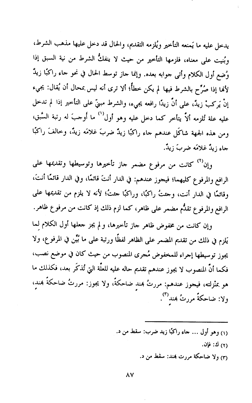 يدخل عليه ما يمنعه التأخير ويلزمه التقديم , والحال قد دخل عليها مذهب الشرط , وبنيت على معناه , فلزمها التأخير من حيث لا ينفك الشرط من نية السبق إذا وضع أول الكلام وأتى جوابه بعده. وإنما جاء توسط الحال في نحو جاء راكباً زيد لأنها إذا صرح بالشرط فيها لم يكن خطأ؛ ألا ترى أنه ليس بمحال أن يقال: يجيء أن يركب زيد , على أن زيداً رافعه يجيء , والشرط مبنى على التأخير إذا لم تدخل عليه علة تلزمه ألا يتأخر كما دخل عليه وهو أول ما أوجب له رتبة السبق , ومن هذه الجهة شاكل عندهم جاء راكباَ زيد ضرب غلامه زيد , وخالف راكباً جاء زيد غلامه ضرب زيد.