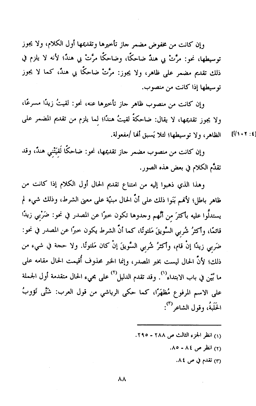 وهذا الذي ذهبوا إليه من امتناع تقديم الحال أول الكلام إذا كانت من ظاهر باطل؛ لأنهم بنوا ذلك على أن الحال مبنية على معنى الشرط , وذلك شيء لم يستدلوا عليه بأكثر من أنهم وجدوها تكون خبراً عن المصدر في نحو: ضربي زيداً قائما , وأكثر شربي السويق ملتوتاً. ولا حجة في شيء من ذلك؛ لأن الحال ليست بخير المصدر , وإنما الخبر محذوف أقيمت الحال مقامه على ما بين في باب الابتداء. وقد تقدم الدليل على مجيء الحال متقدمة أول الجملة على الاسم المرفوع مظهراً , كما حكي الرياشي من قول العرب: شتى تؤوب الحلبة , وقول الشاعر: