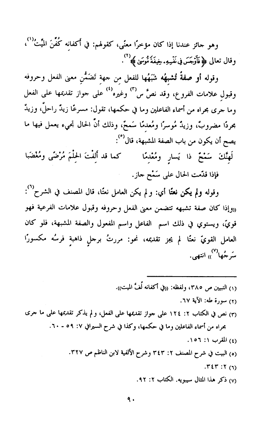 (وإذا كان صفة تشبهه تتضمن معنى الفعل وحروفه وقبول علامات الفرعية فهو قوى , ويستوي في ذلك اسم الفاعل واسم المفعول والصفة المشبهة , فلو كان العامل القوي نعتاً لم يجز تقديمه , نحو: مررت برجل ذاهبة فرسه مكسوراً سرجها) انتهى.