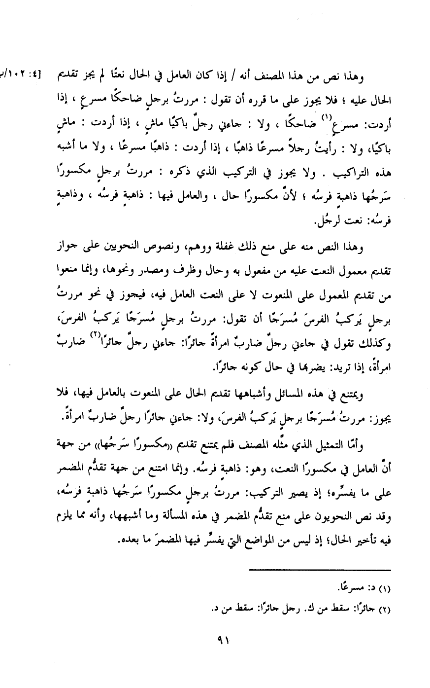 وهذا نص من هذا المصنف انه / إذا كان العامل في الحال نعتاً لم يجز تقديم الحال عليه؛ فلا يجوز علي ما قرره أن تقول: مررت برجل ضاحكاً مسرعٍ , إذا أرت: مسرع ضاحكاً , ولا: جاءني رجل باكياً ماش , إذا أردت: ذاهباً مسرعا ولا ما أشبه هذه التراكيب. ولا يجوز في التركيب الذي ذكره: مررت برجل مكسوراً سرجها ذاهبة فرسه؛ لان مكسوراً حال , والعامل فيها: ذاهبة فرسه , وذاهبة فرسه: نعت لرجل.