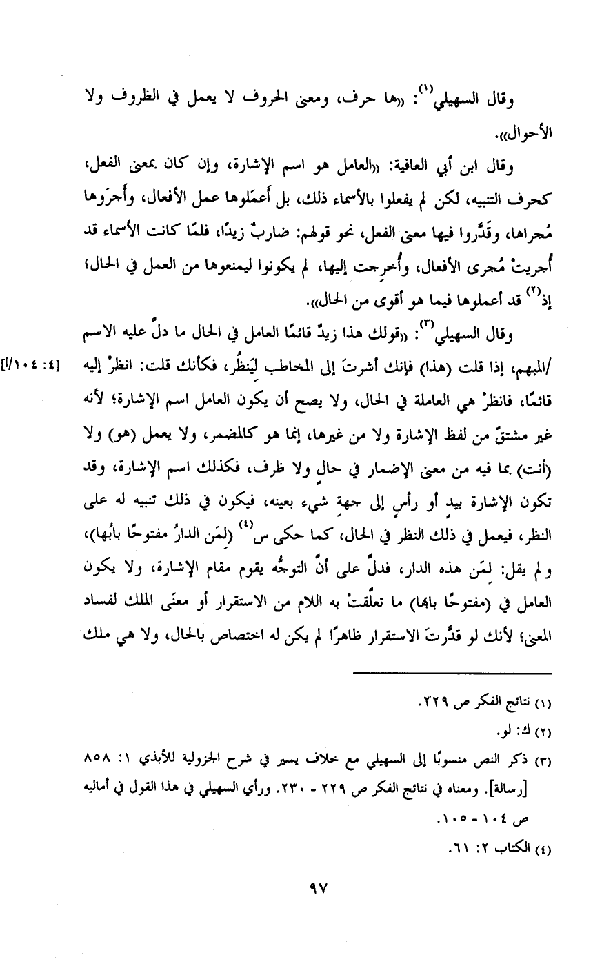 وقال السهيلى: «قولك هذا زيد قائما العامل فى الحال ما دل عليه الاسم /المبهم, إذا قلت (هذا) فإنك أشرت إلى المخاطب لينظر, فكأنك قلت: انظر إليه قائما, فانظر هى العاملة فى الحال, ولا يصح أن يكون العامل اسم الإشارة؛ لأنه غير مشتق من لفظ الإشارة ولا من غيرها, إنما هو كالمضمر, ولا يعمل (هو) ولا (أنت) بما فيه من معنى الإضمار فى حال ولا ظرف, فكذلك اسم الإشارة, وقد تكون الإشارة بيد أو رأس إلى جهة شئ بعينه, فيكون فى ذلك تنبيه له على النظر, فيعمل فى ذلك النظر فى الحال, كما حكى س (لمن الدار مفتوحا بابها) , ولم يقل: لمن هذه الدار, فدل على أن التوجه يقوم مقام الإشارة, ولا يكون العامل فى (مفتوحا بابها) ما تعلقت به اللام من الاستقرار أو معنى الملك لفساد المعنى؛ لأنك لو قدرت الاستقرار ظاهرا لم يكن له اختصاص بالحال, ولا هي ملك