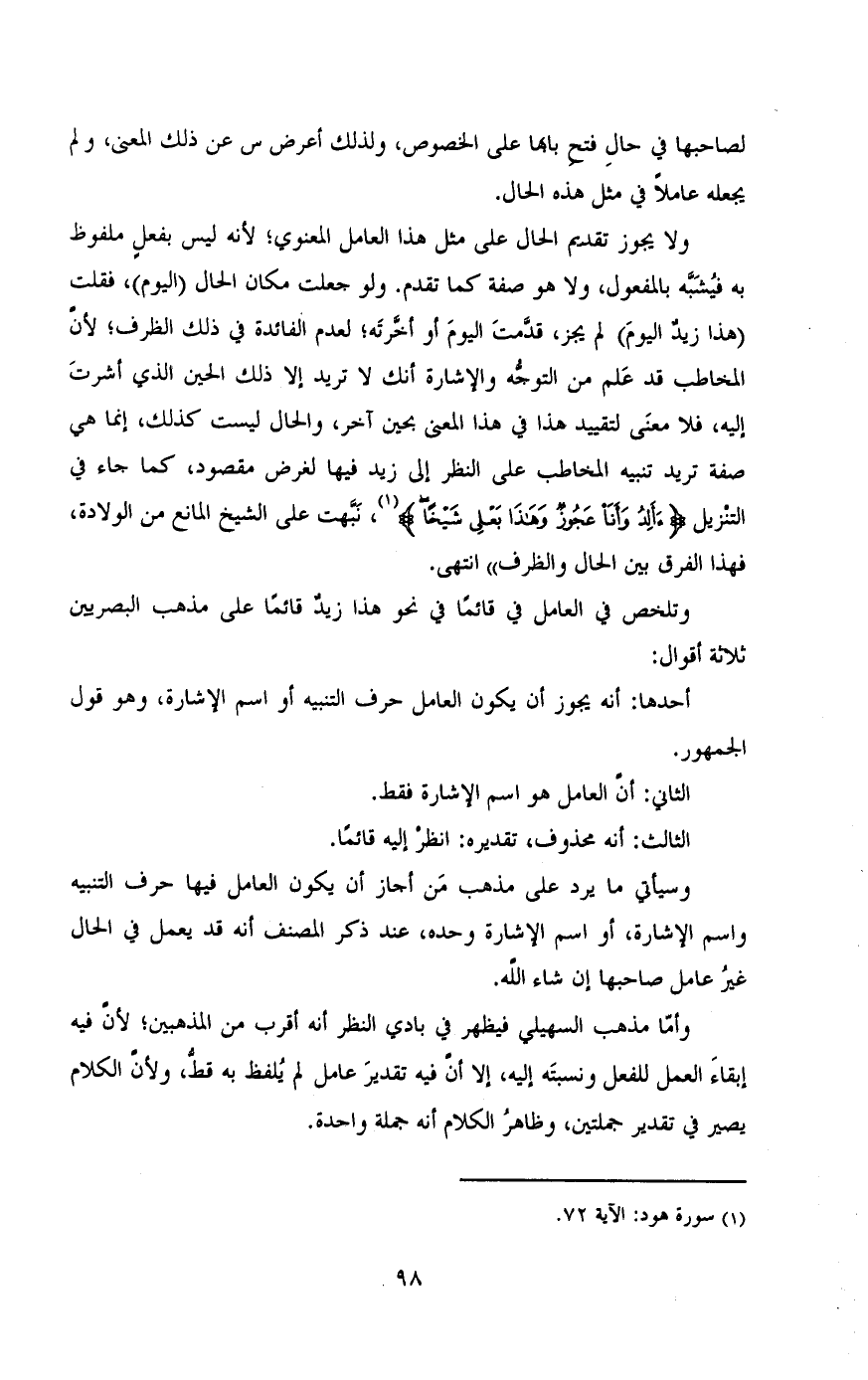 ولا يجوز تقديم الحال على مثل هذا العامل المعنوى؛ لأنه ليس بفعل ملفوظ به فيشبه بالمفعول, ولا هو صفة كما تقدم. ولو جعلت مكان الحال (اليوم) , فقلت (هذا زيد اليوم) لم يجز, قدمت اليوم أو أخرته؛ لعدم الفائدة فى ذ لك الظرف؛ لأن المخاطب قد علم من التوجه والإشارة انك لا تريد إلا ذلك الحين الذى أشرت إليه, فلا معنى لتقييد هذا فى هذا المعنى بحين آخر, والحال ليست كذلك, إنما هى صفة تريد تنبيه المخاطب على النظر إلى زيد فيها لغرض مقصود, كما جاء في التنزيل (ءألد وأنا عجوز وهذا بعلى شيخا) ,