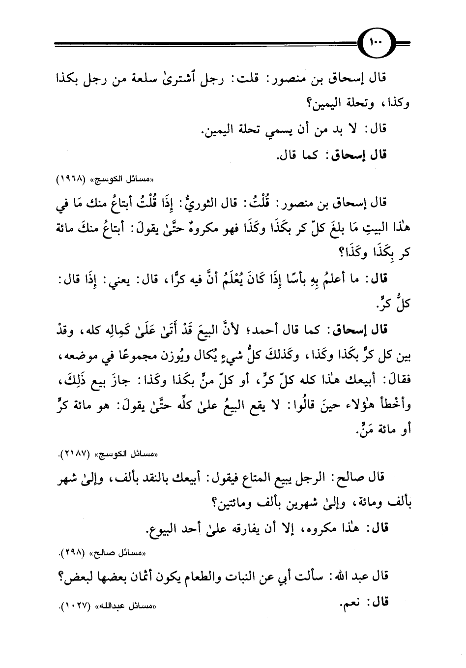 قال إسحاق بن منصور: قُلْتُ: قال الثوريُّ: إِذَا قُلْتُ أبتاعُ منك مَا في هذا البيتِ مَا بلغَ كلّ كر بكَذَا وكَذَا فهو مكروهٌ حتَى يقولَ: أبتاعُ منكَ مائة كر بِكَذَا وكَذَا؟