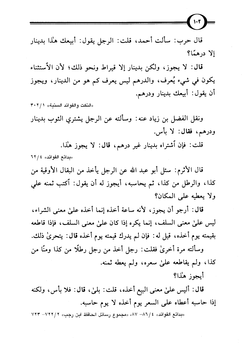 ونقل الفضل بن زياد عنه: وسألته عن الرجل يشتري الثوب بدينار ودرهم، فقال: لا بأس.