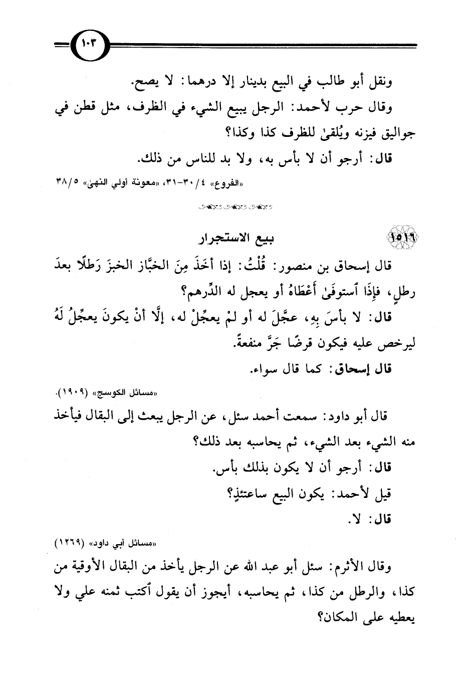 قال إسحاق بن منصور: قُلْتُ: إذا أخَذَ مِنَ الخبَّاز الخبزَ رَطلًا بعدَ رطلٍ، فإِذَا استوفَى أَعْطَاهُ أو يعجل له الدّرهم؟